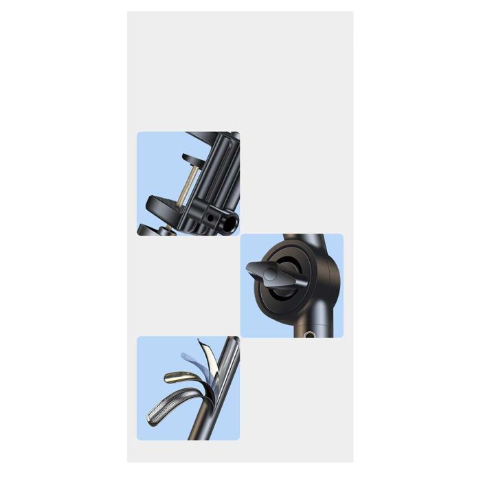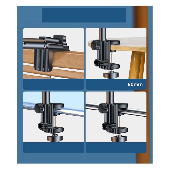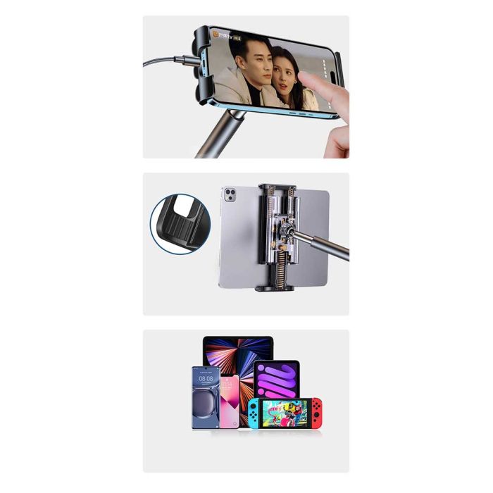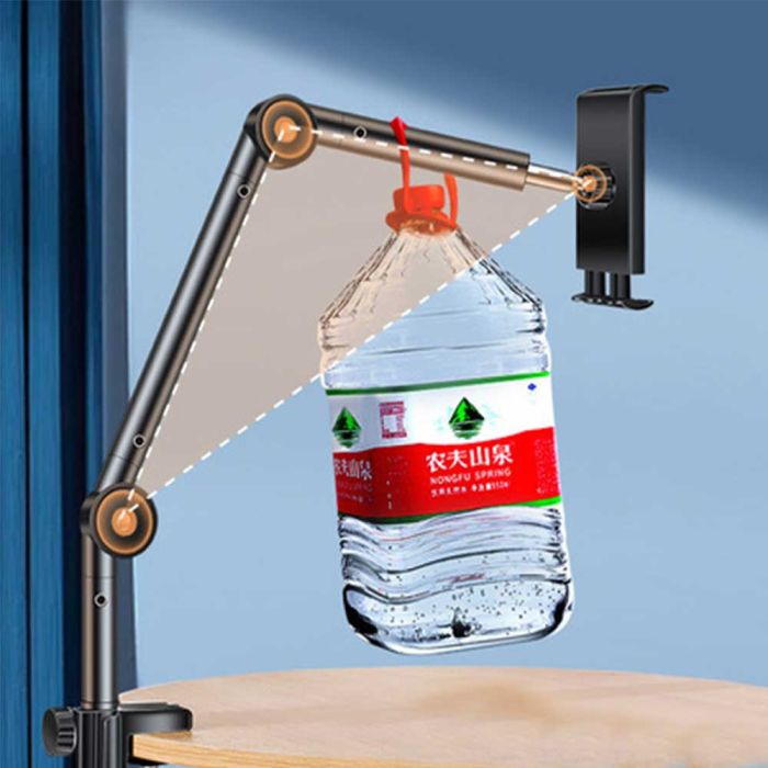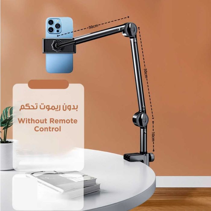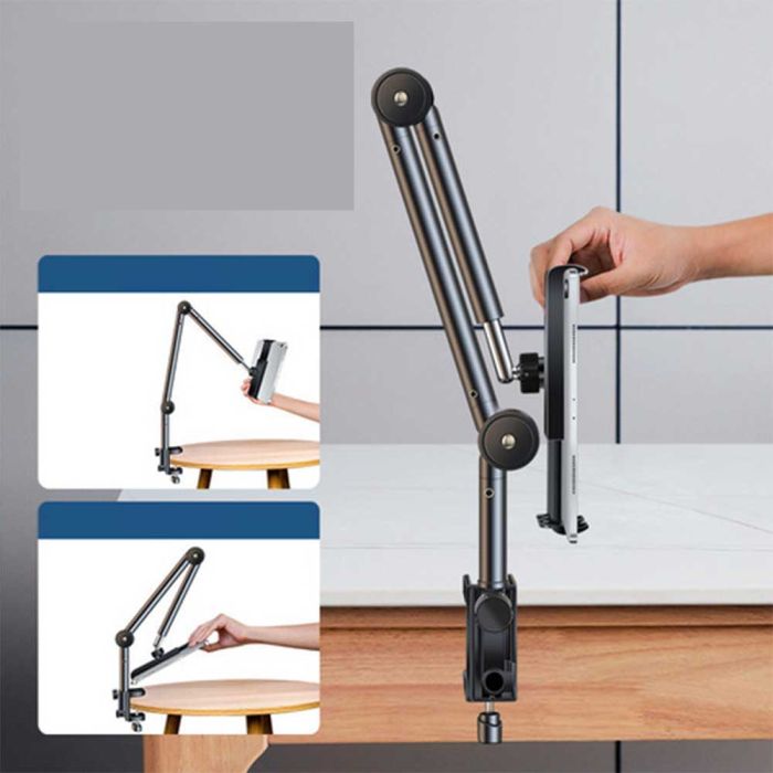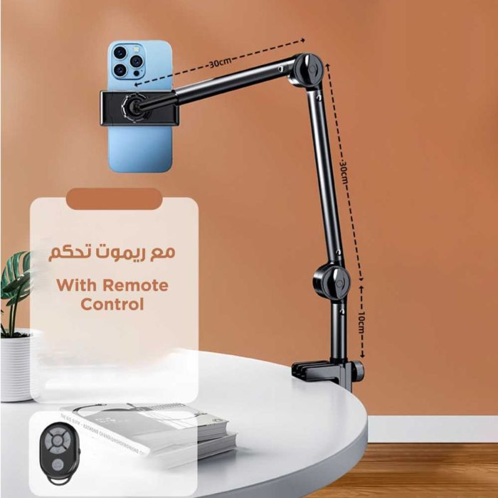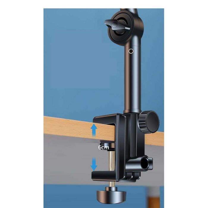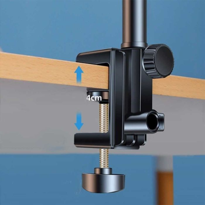Enjoy flexibility and strength with this multi-purpose metal stand for phones . A flexible arm with free rotation provides ideal viewing angles, while the triangular structure delivers excellent stability even for larger devices. The clamp with rubber padding safeguards your desk from scratches. Perfect for video recording, online meetings, watching movies, or studying, all with an elegant and practical design.