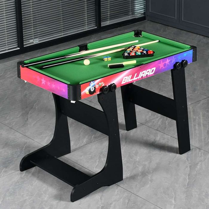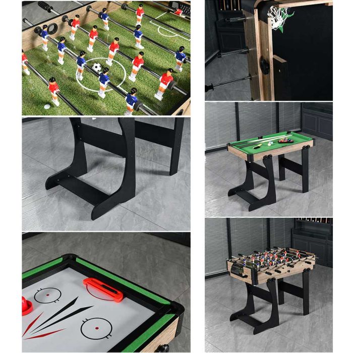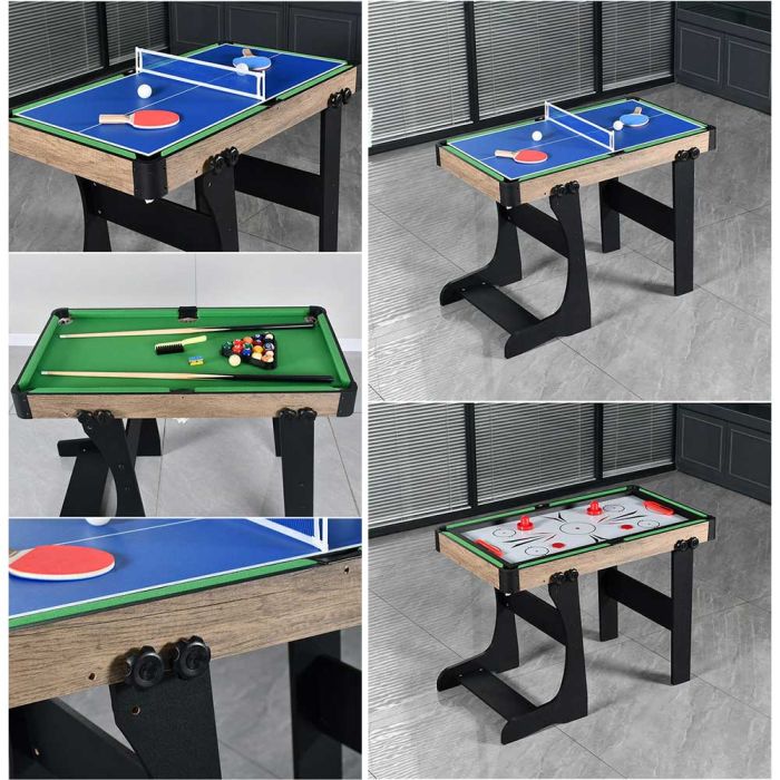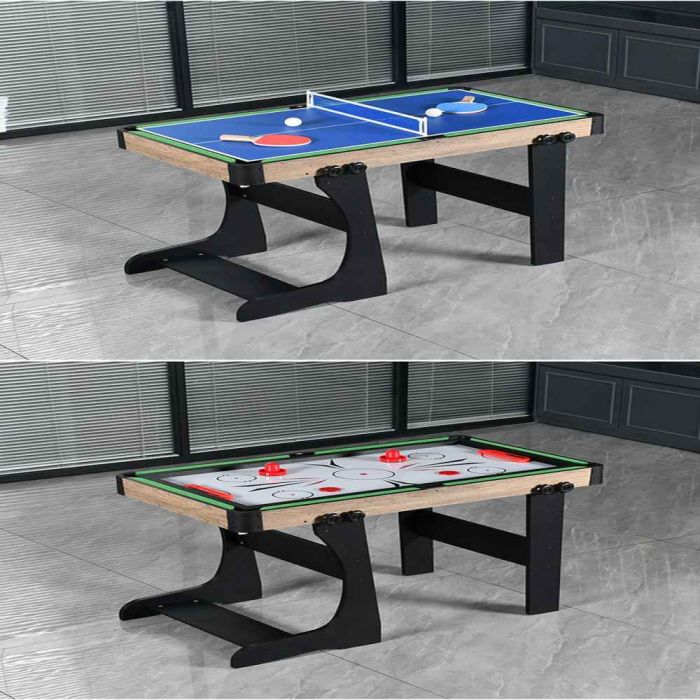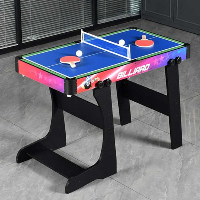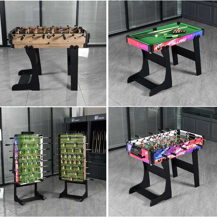 This foldable 4-in-1 multi-game table is made from a stable frame offering excellent balance, combining billiards, foosball, air hockey, and table tennis in one design, providing diverse entertainment and easy storage after use