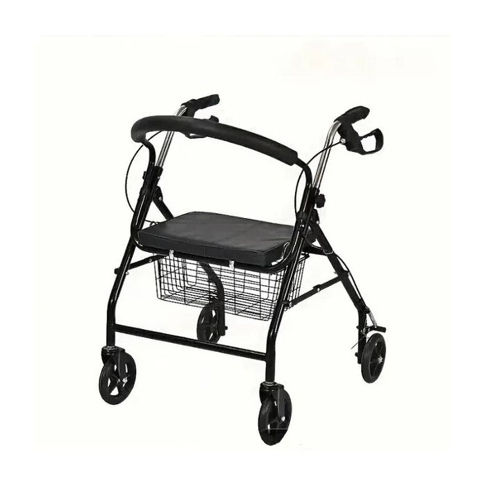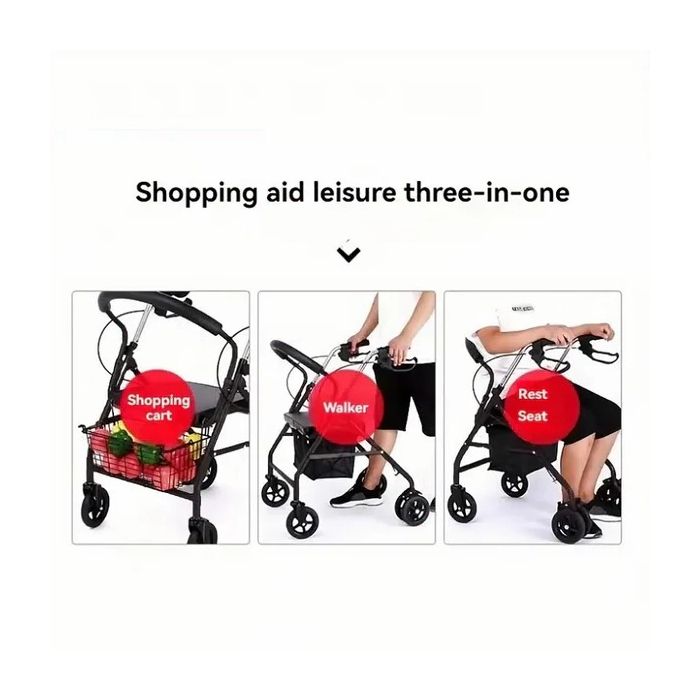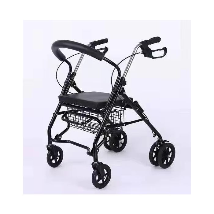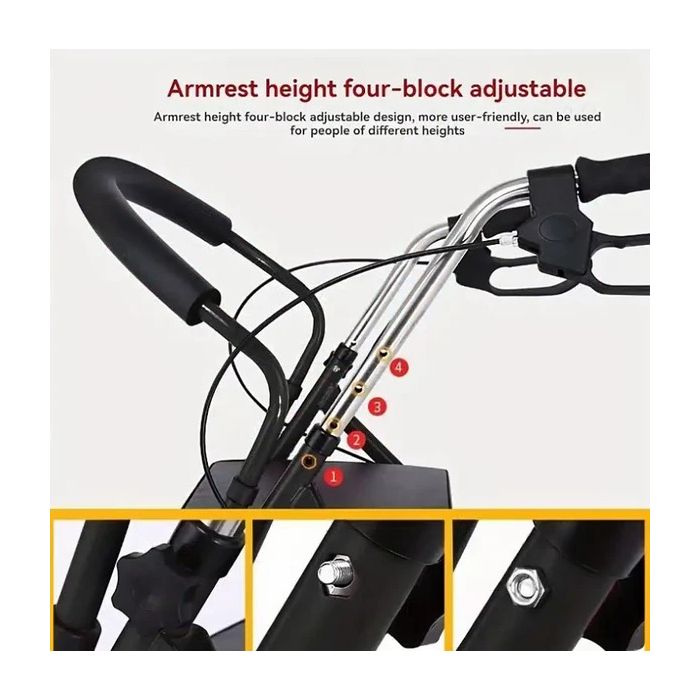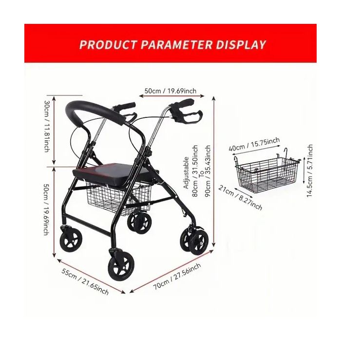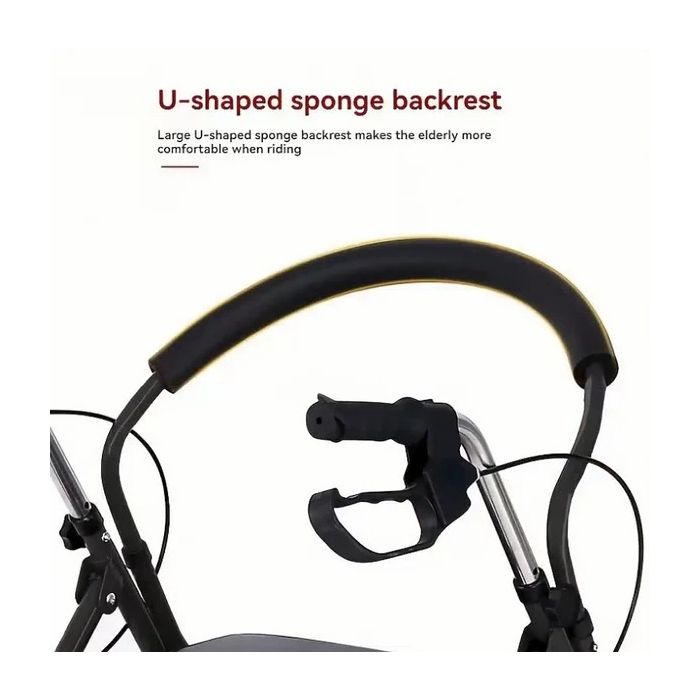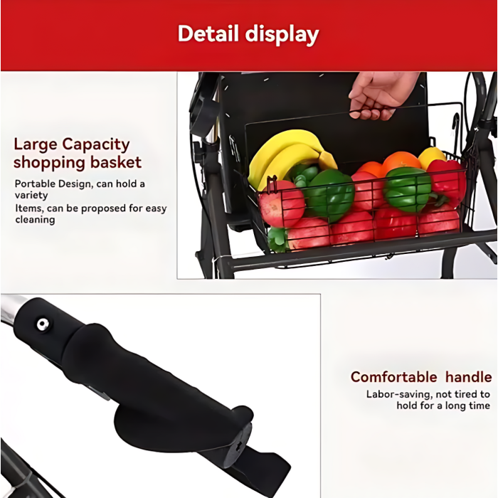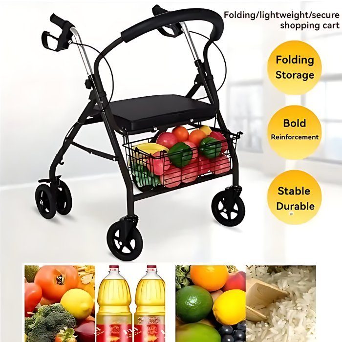 This folding walker is designed to support safe mobility, facilitate shopping, and provide optimal comfort for seniors. The integrated dual handbrake system allows for smooth slowing when lifting and secure wheel locking when lowered. The four-level adjustable armrest ensures comfortable support for users of varying heights and body positions. The soft PU leather-padded seat and U-shaped foam backrest provide comfortable support during rest periods.