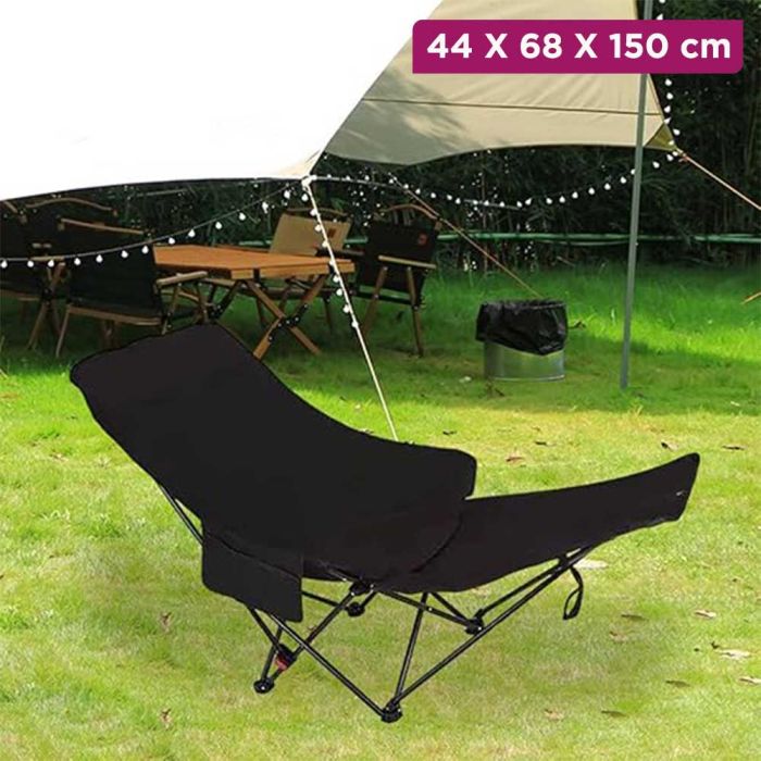 A foldable outdoor recliner chair with a comfortable design and three-position backrest, suitable for camping, the beach, and travel. Made with a sturdy steel frame and high-quality Oxford fabric for excellent stability and long-lasting durability. Its foldable design makes it easy to carry and store in the included bag.
