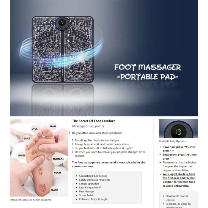 Relaxing and effective foot massage experience, with six different modes and variable speed control to relieve pain and improve sleep and mood. Its compact and ergonomic design makes it easy to use at home for a relaxing and focused daily massage experience.