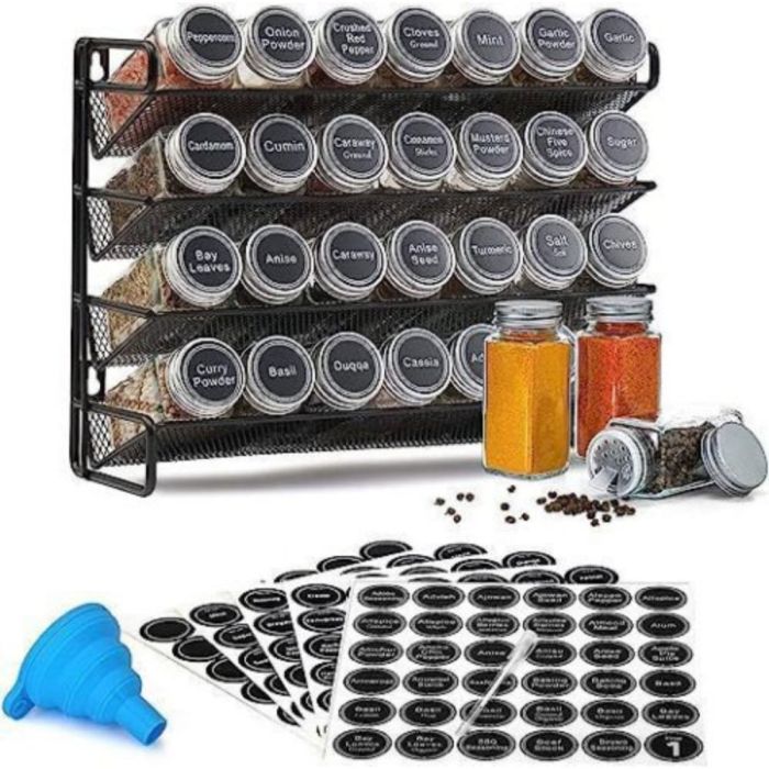 - Four Layer Metal Spice Rack with 28 Glass Jars and Funnel