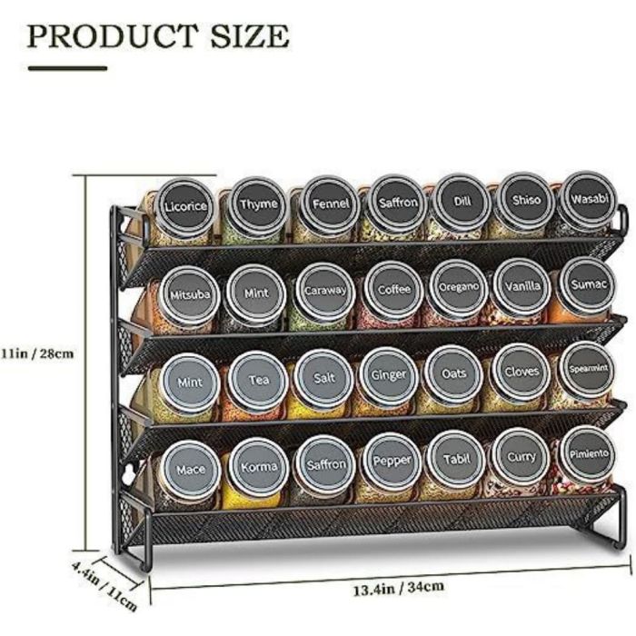 This Four layer metal spice rack set with 28 bottles, made of durable metal, provides perfect spice organization with clear display and easy access, elegant mesh design suitable for kitchen countertops with a modern professional touch.