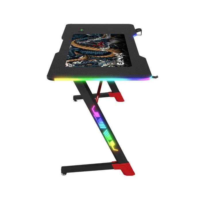 Elevate your gaming setup with the Gamax D2501 desk, offering an immersive lighting experience thanks to a three-sided RGB lighting system that illuminates the front edge and table legs. It features an 18mm thick carbon fiber surface for greater rigidity and durability than traditional desks, along with a sleek, modern design. The desk comes equipped with a headphone holder and cup holder to keep your space organized, as well as a large mouse pad for smooth control. The Z-shaped metal frame ensures robust stability during intense gaming sessions, while a practical design allows for neat cable management.