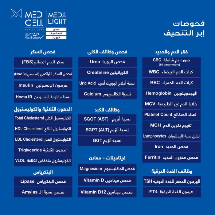 Check up include: Anemia Test - CBC) -WBC - RBC - Hemoglobin - Hematocrit - MCV - MCH- MCHC- RDW -Platelet Count -Mean Platelet Volume -Absolute Neutrophils - Lymphocytes - Absolute Monophocytes - Absolutes Eosinphil - Basophil Percentage -Absolute Basophils -Iron -Ferritin-Vitamin D- B12-Magnesium- TFT-TSH -F.T4 - Diabetes -Fasting Blood Sugar (FBS)- Glycosylated Hemoglobin (HbA1C) -Insulin -Homa IR -Triglyceride & Cholesterol -Total Cholesterol -HDL Cholesterol -LDL Cholesterol -Triglyceride• VLDL -Kidney Profile •Urea• Creatinine•Uric Acid• Calcium -Liver Profile •SGOT (AST)• SGPT (ALT) -GGT -Pancreas -Amylas -Lipase