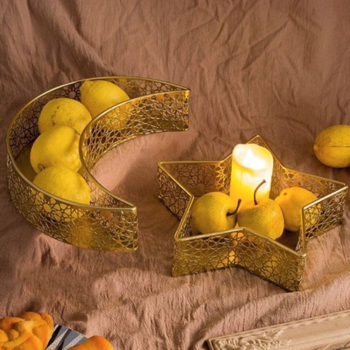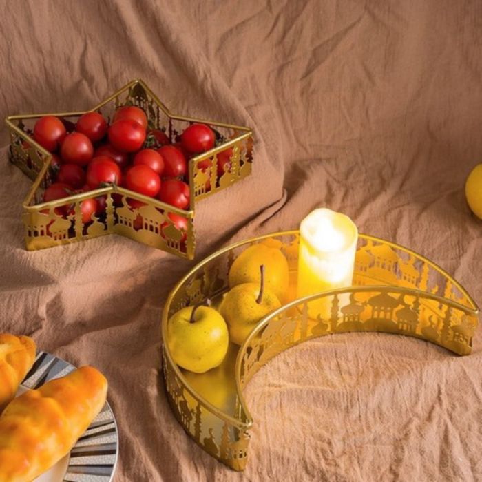 This Golden star and moon tray set 2 pieces made of iron, elegant design adds a luxurious touch to serving tables, suitable for displaying fruits and hospitality items, decorative appearance that blends with various décor styles, and maintains its quality with use