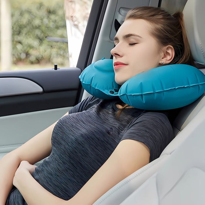 Relax with eco-friendly travel gear , This Inflatable Travel Neck Pillow with Nape Support is made to give your neck more comfort and support on those long trips. The ergonomic shape of this cushion guarantees that the head and neck are properly aligned, which lessens strain and discomfort.Its Perfect for using in vehicles, on aircraft, or anywhere you need a peaceful break.