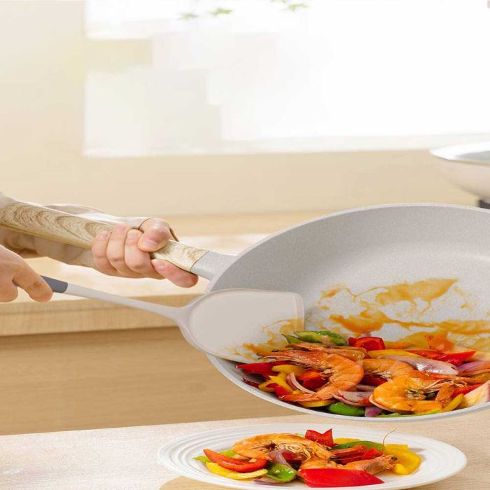 This silicone set with spatula, spoon, and ladle withstands high temperatures and protects non-stick cookware from scratches, featuring a comfortable grip for easy stirring and flipping, a smooth surface that prevents food from sticking, quick cleaning after use, durable and lightweight, an ideal addition for preparing sauces, frying, and daily mixing while maintaining lasting quality.