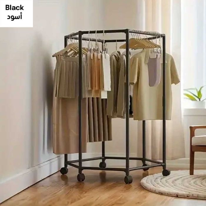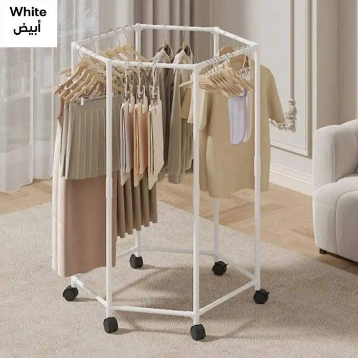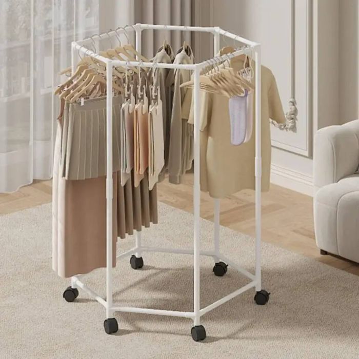 Discover the hexagonal clothes stand, which combines modern design with practicality for home use. Its unique geometric design allows you to hang your clothes at a 360-degree angle, saving you extra space and making your favorite pieces easier than ever. Thanks to its rotating wheels, it can be easily moved around the home, giving you complete flexibility in organizing your personal space. It's the perfect solution for eliminating clutter and adding a touch of elegance to your home.