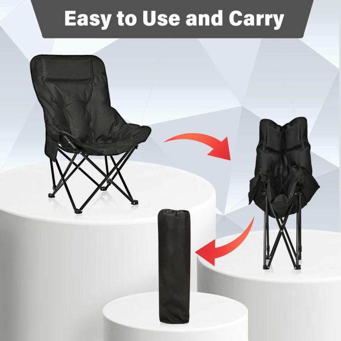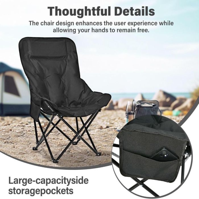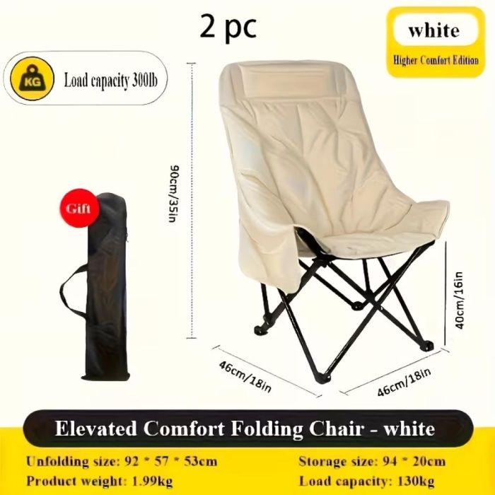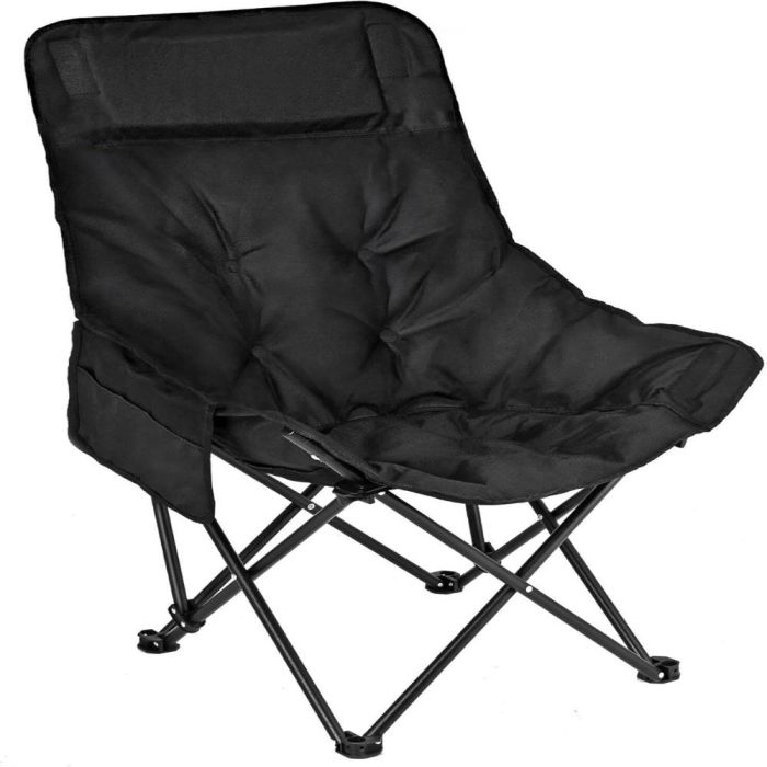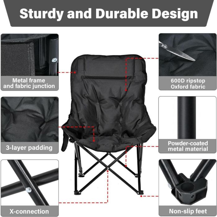 A high-back camping chair, sturdy and comfortable, foldable and easy to carry, with a weight capacity of up to 150 kg. It features a strong steel frame with double-layered, tear-resistant Oxford fabric, making it suitable for intensive use and long trips.