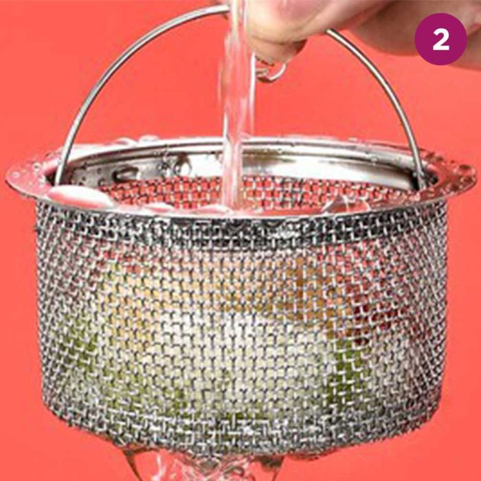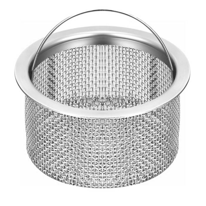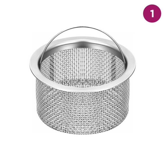 Durable mesh sink filter designed to prevent clogs and catch food debris effectively. Made of rust-resistant metal and reusable for long-term use. Features a liftable design for quick cleaning and is available in two styles to fit different kitchen sinks.