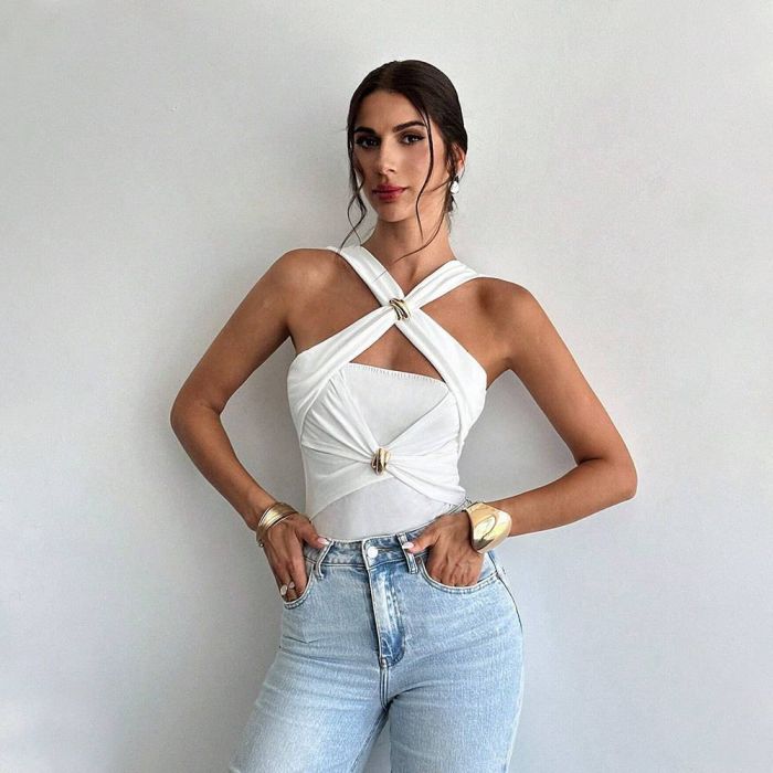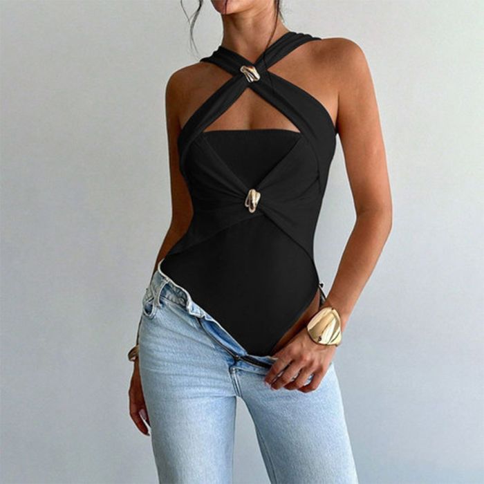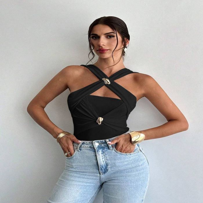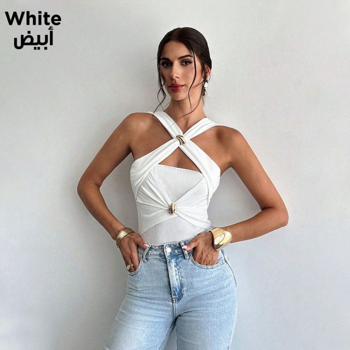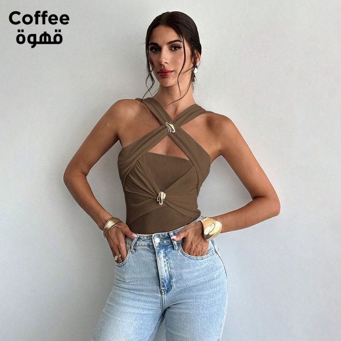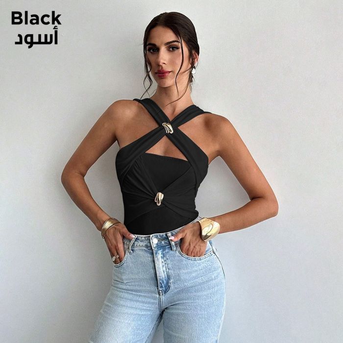 Elegant Cross Neck Top for Women is made of a flexible and supportive fabric blend ensuring an attractive and comfortable look, this top features a cross-neck design that boldly showcases the shoulders with a modern flair, the elegant metal clasp adds a luxurious touch to the chest area, making it perfect for evenings and special occasions, it provides light support and helps sculpt the figure beautifully, this top maintains its high quality and flexibility, ensuring lasting style and stability.