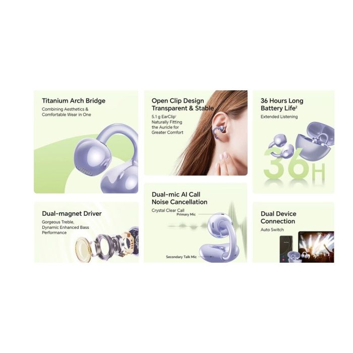 Experience the perfect blend of style, comfort, and clarity with the Honor Choice Earbuds Clip. Designed with a lightweight titanium arch bridge and open‑ear fit, these earbuds provide a breathable, stable wear experience. With up to 36 hours total battery life, they’re ideal for long work days, workouts, or commuting