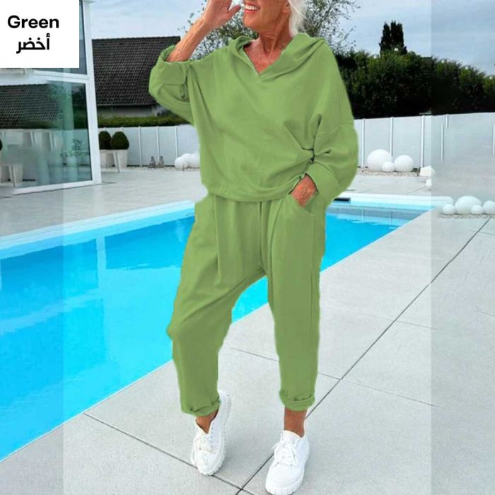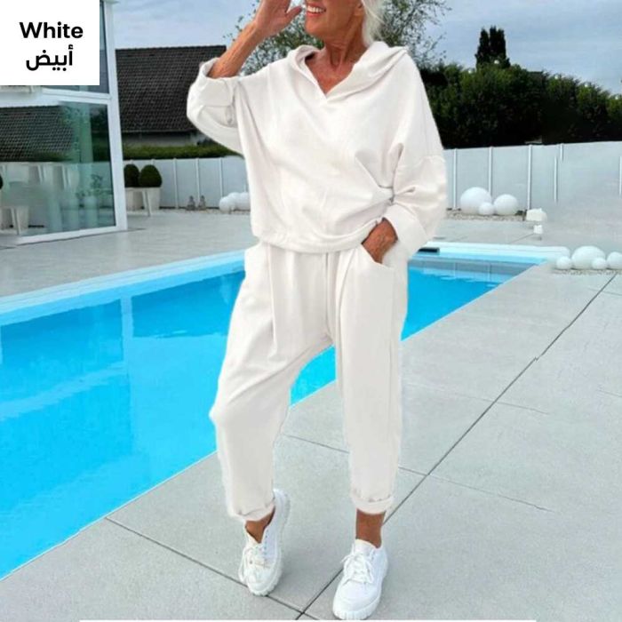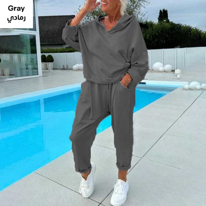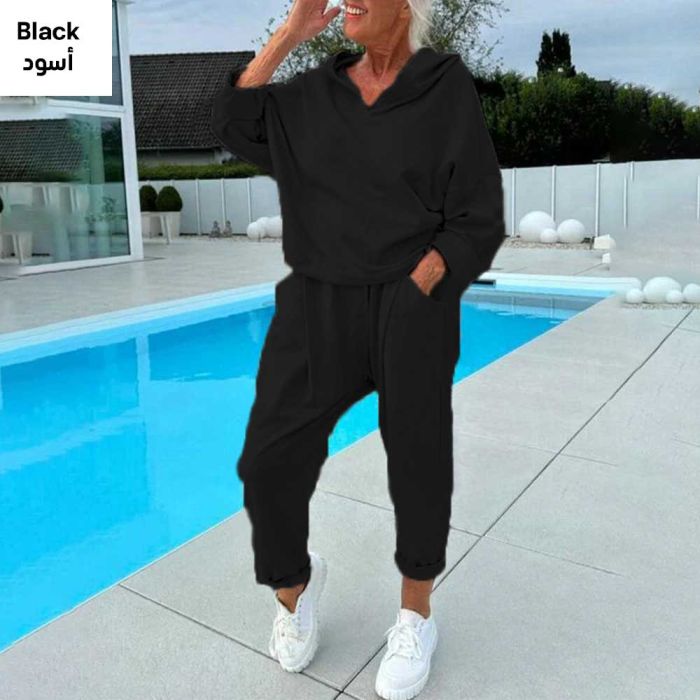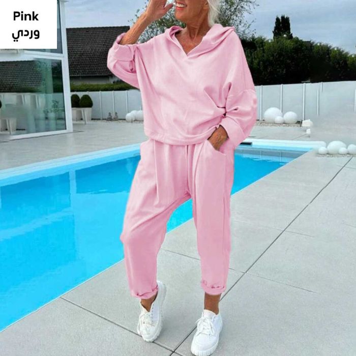 This women's sports hoodie set is crafted from high-quality fabrics to ensure comfort and flexibility during movement. It features a stylish and modern design that suits all tastes, adding a touch of elegance to your daily look. It provides warmth and comfort at all times, thanks to its durable materials that withstand frequent use and ensure a distinctive appearance that lasts long.