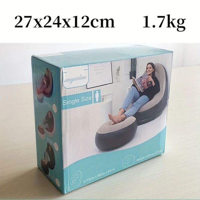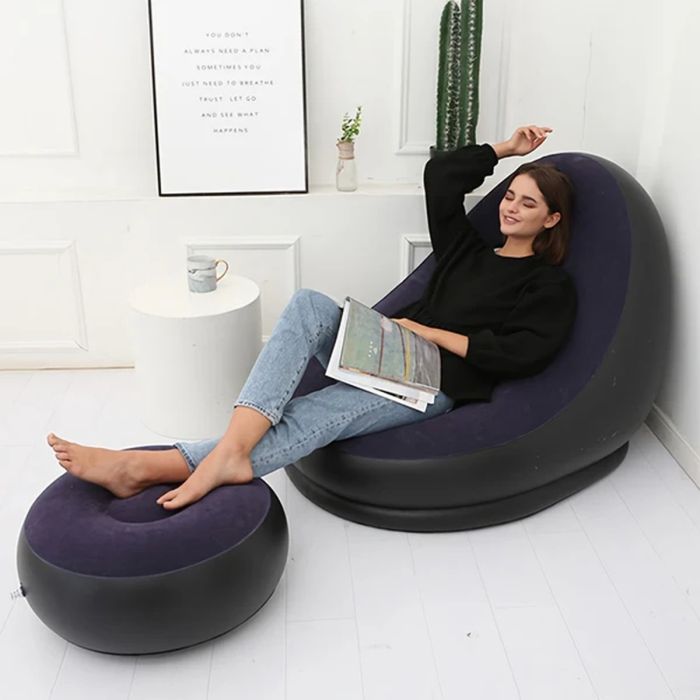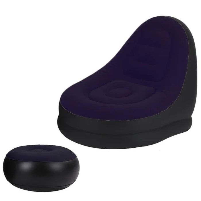 The Inflatable Couch with Footrest in blue is a comfortable and portable seating solution perfect for indoor or outdoor use. Made from durable, water-resistant material, it easily inflates and deflates for quick setup and storage. The built-in footrest provides extra comfort, making it ideal for lounging, camping, or relaxing at home. Its lightweight design allows for easy transport, while the vibrant blue color adds a fun and stylish touch to any space