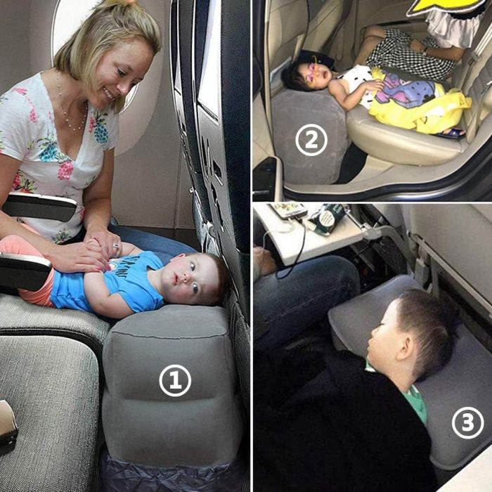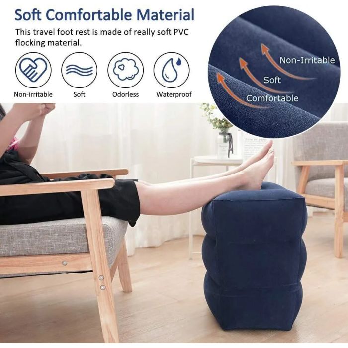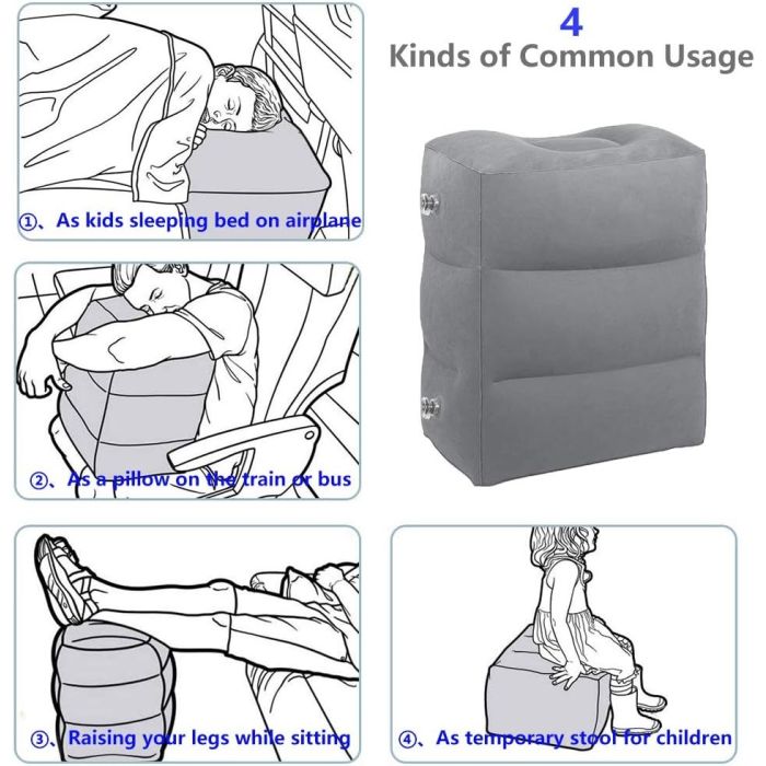 This inflatable footrest is the must-have travel essential to keep you happy and comfortable on long flights, car, and train rides by transforming the cramped space in between seats into a soft, comfortable footrest for laying down or elevating your feet and legs. Adjustable Height Leg Rest, Can be used as Airplane Bed for Kids, Pillow for Airplane, Car, Train, Home, Office