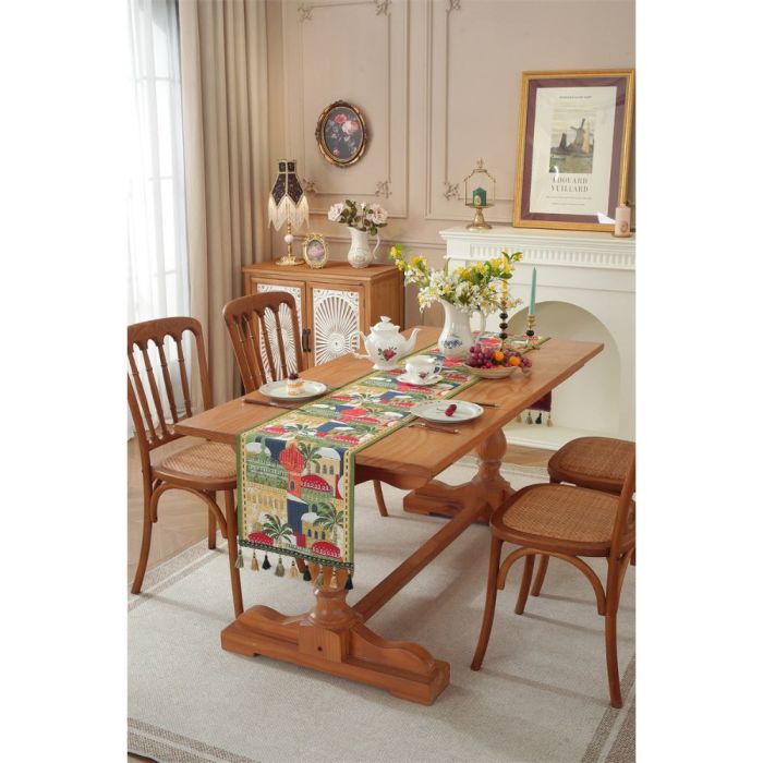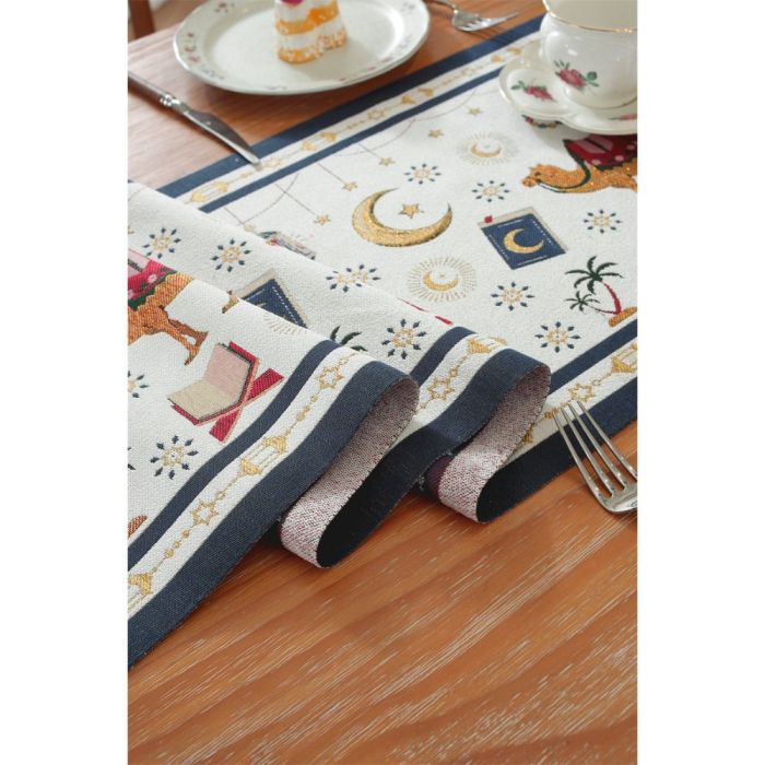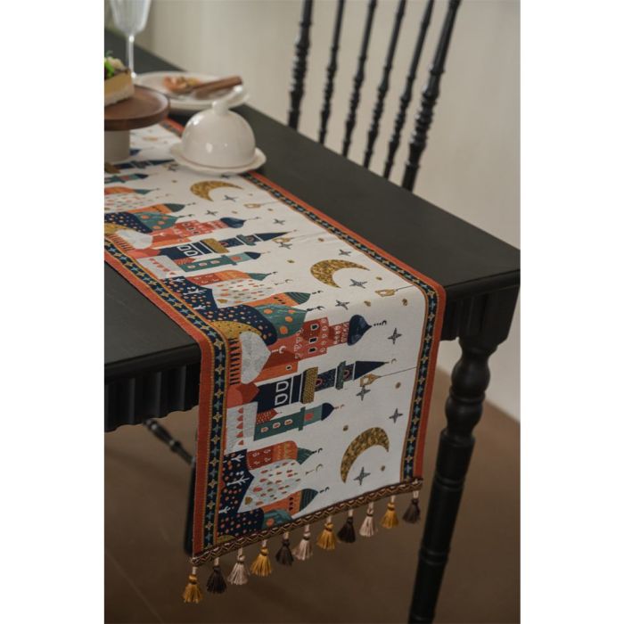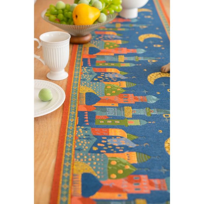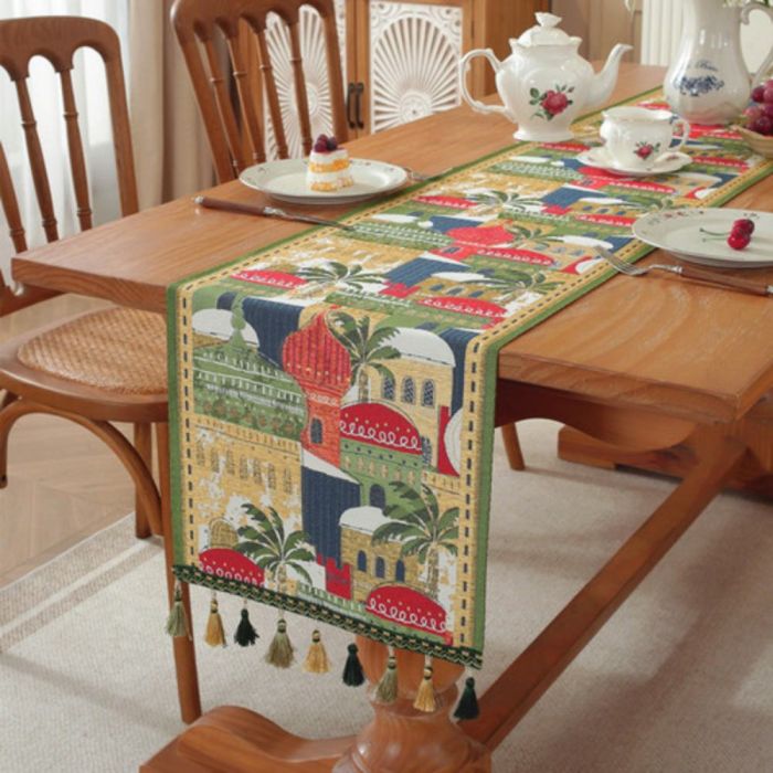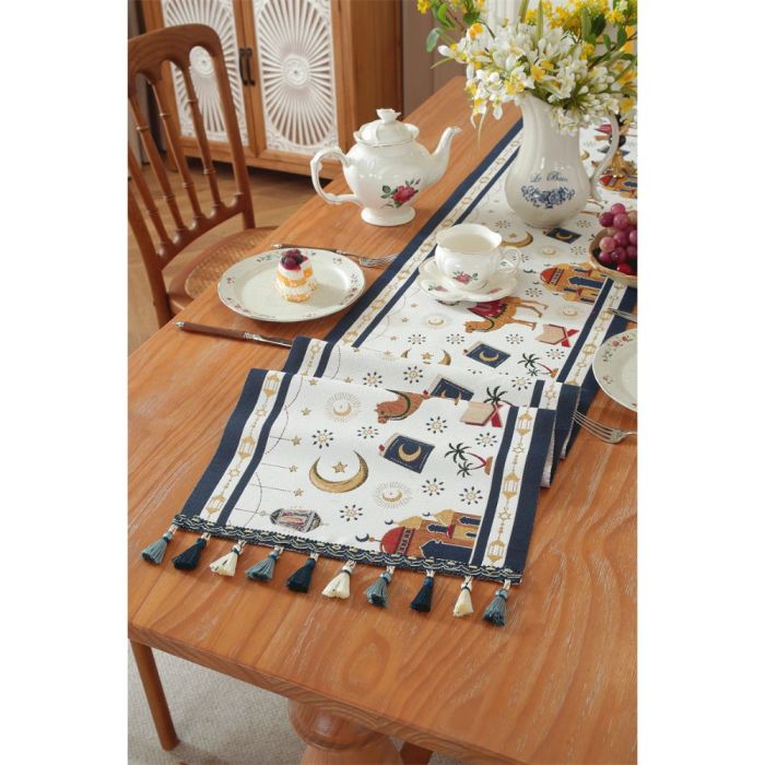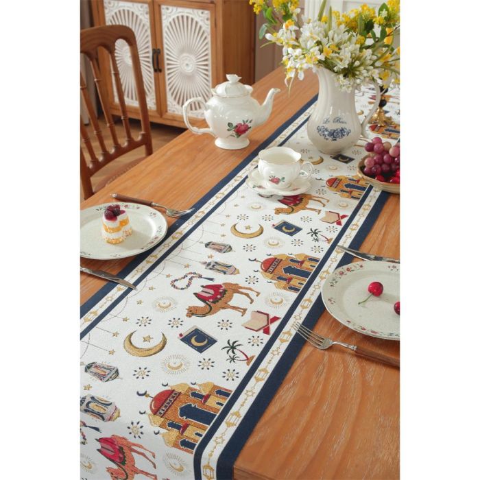 This Jacquard table runner long design made of polyester fibers, elegant Middle Eastern pattern adds a warm touch to dining tables, suitable for daily use and special occasions, attractive design that complements various décor styles, and maintains its quality over time