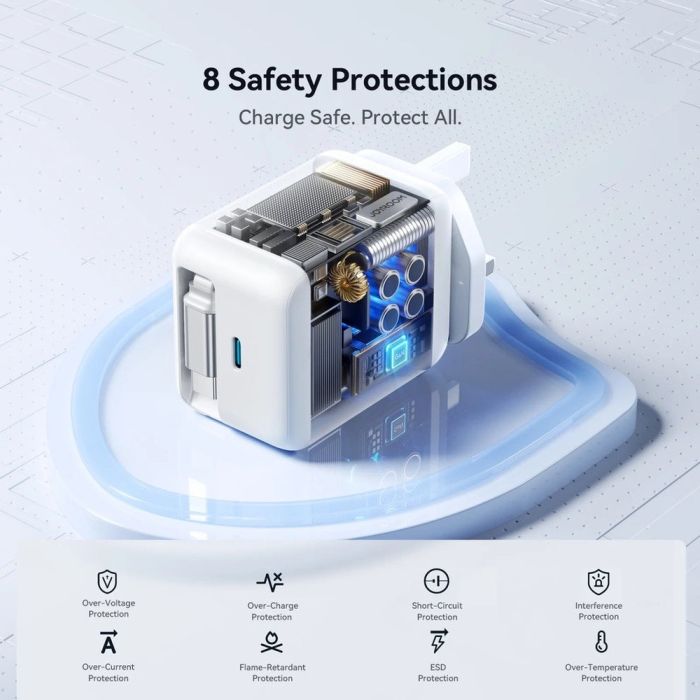 Make charging your devices a seamless part of your daily routine. Joyroom's GaN charger delivers 67W fast charging with a built-in cable for easy use on the go or at home. With the capacity to fit phones, tablets, and some lightweight laptops, Joyroom offers a reliable and compact solution that combines performance and portability with protective features to protect your devices while charging.