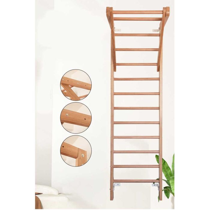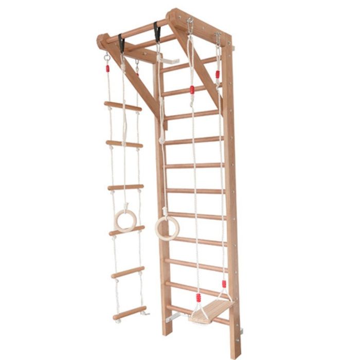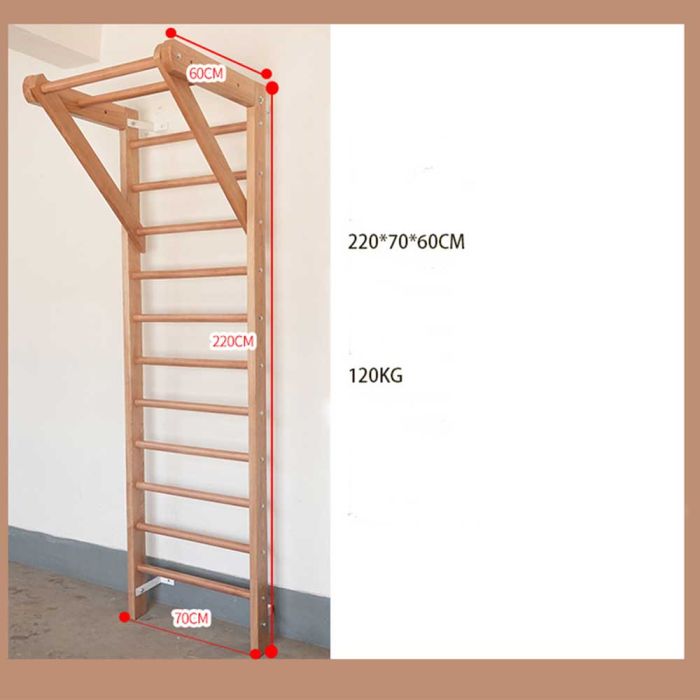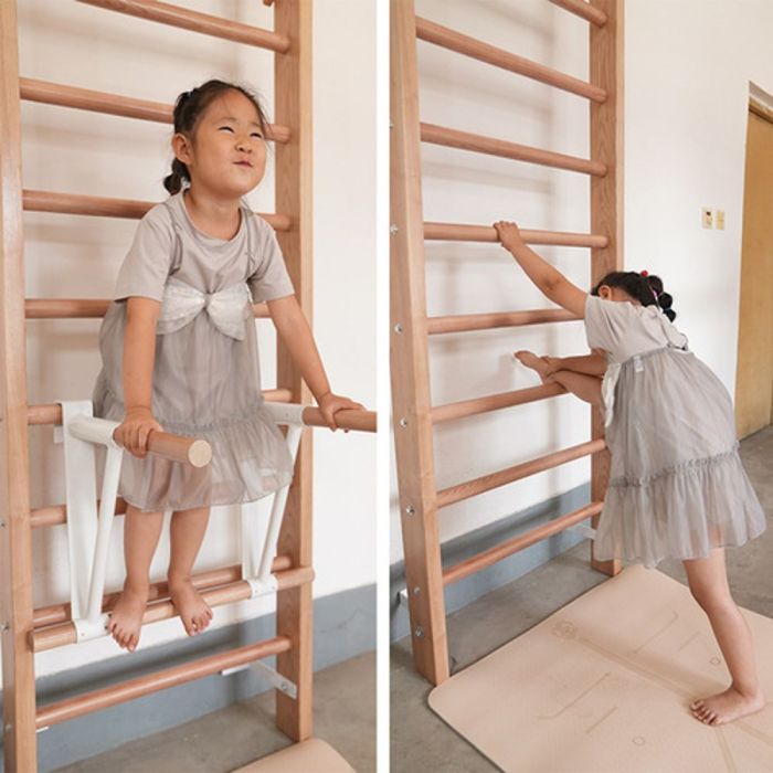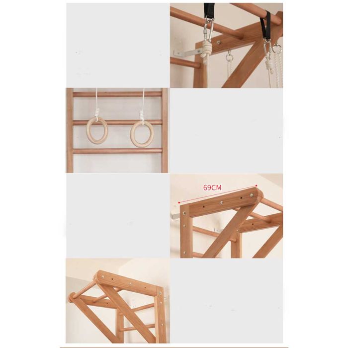 This multifunctional kids climbing frame offers a safe and engaging space for climbing, stretching, and balance training. Built from strong ash wood for high stability, it includes hanging rings and a soft rope ladder to support strength development, while the wall-mounted design makes it a practical and fun activity station.