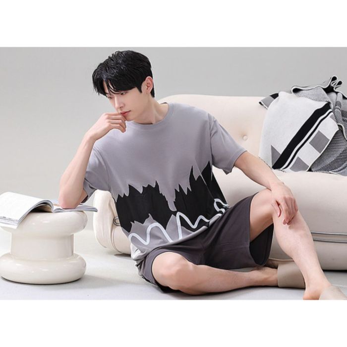 - Korean Design Grey Short Sleeve Ice Silk Pajama Set For Men