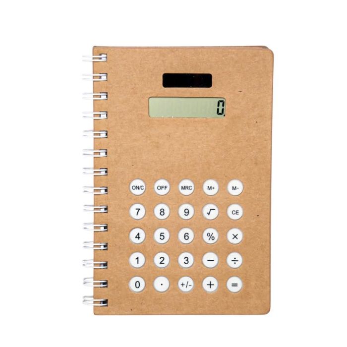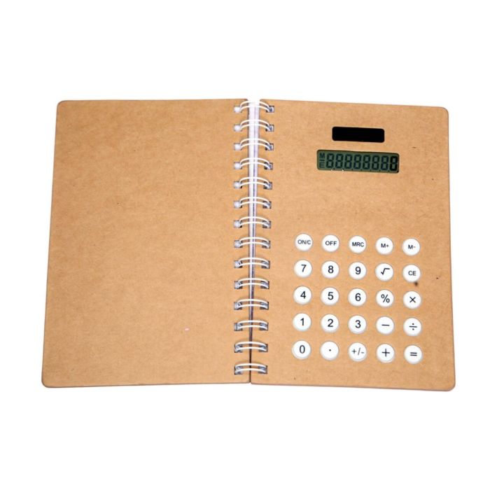 Combines the utility of a spiral-bound diary and an 8‑digit solar-powered calculator in one stylish and sustainable design. The hardcover is crafted from durable hard Kraft paper with a natural look, offering a minimal, eco-conscious aesthetic. The built-in solar calculator operates reliably under light, powered by silicone and solar components, with memory and basic math function keys for everyday use.