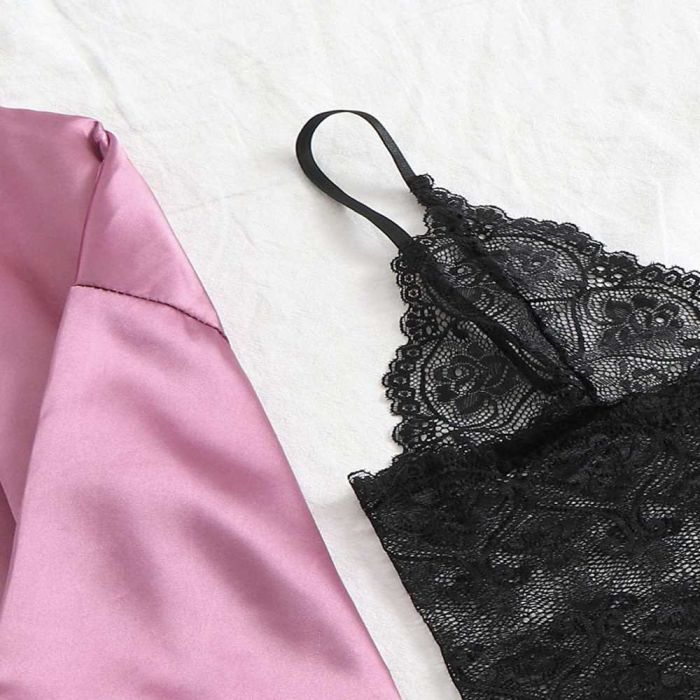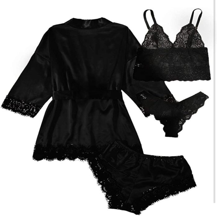 - 4 pieces (short robe with waist tie, lace bra with thin straps, satin shorts with lace trim, lace bikini panty)