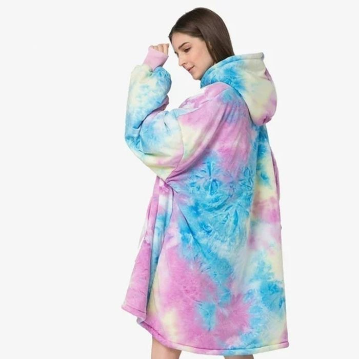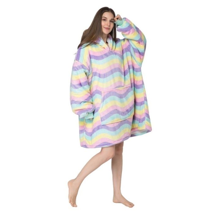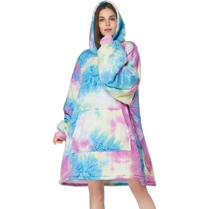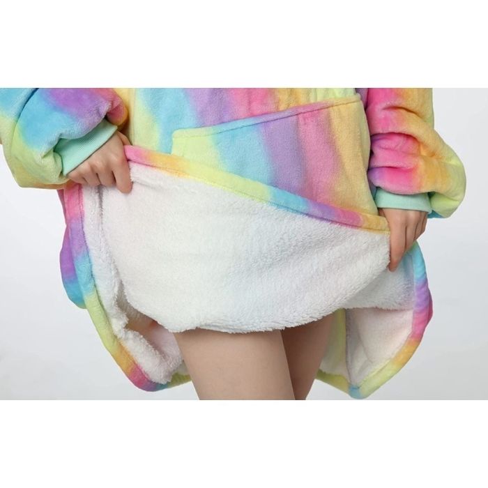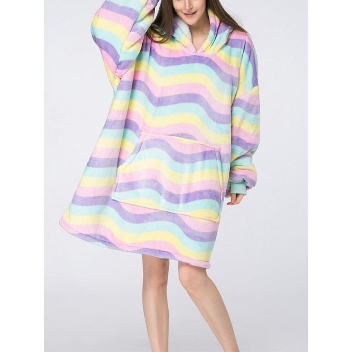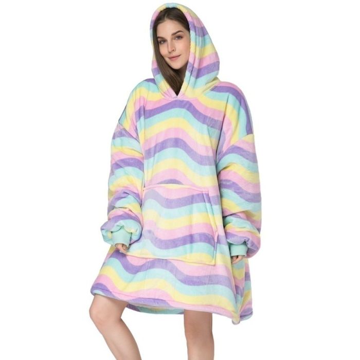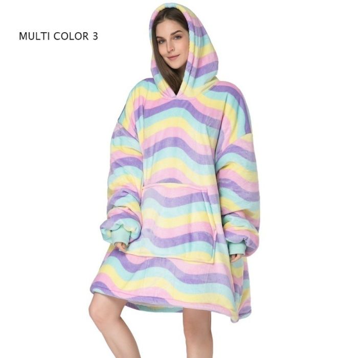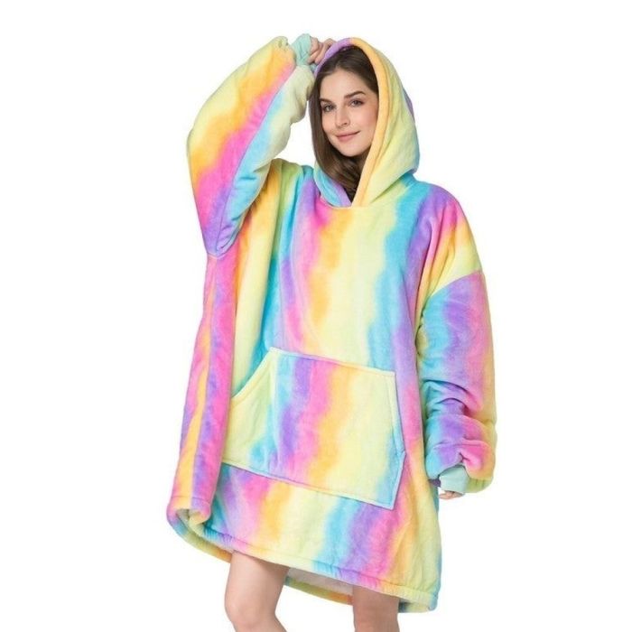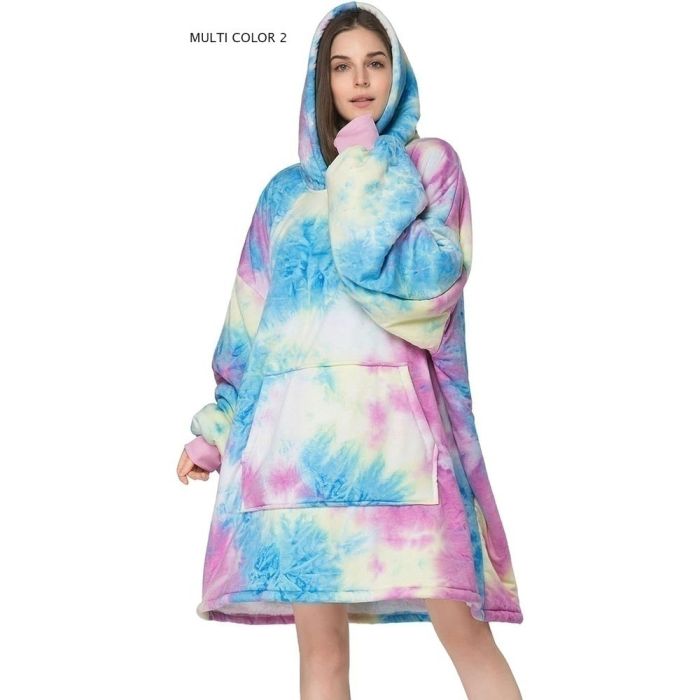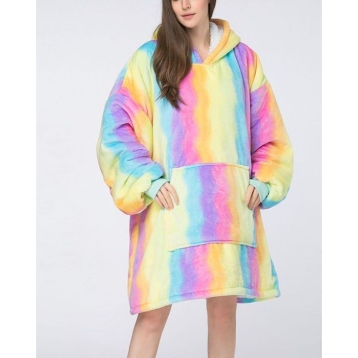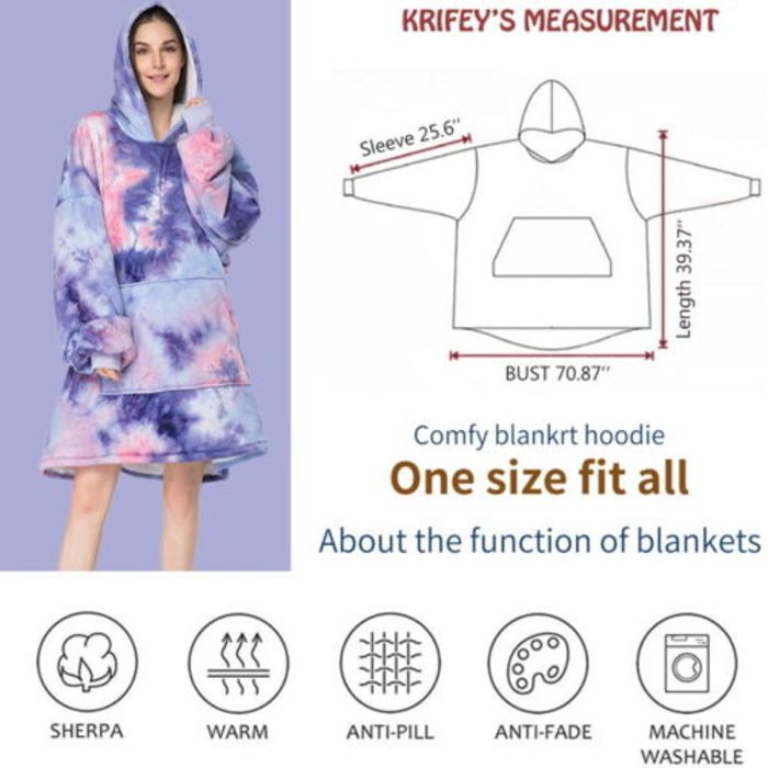 This oversized blanket hoodie is designed to be one size fits all, with roomy pockets and a luxurious double-layered fleece and sherpa lining. Its reversibility gives you a choice of texture or color, making it a must-have for your winter wardrobe.Today's Deal is Large Reversible Huggle Hoodie with Sherpa Lining