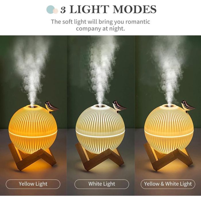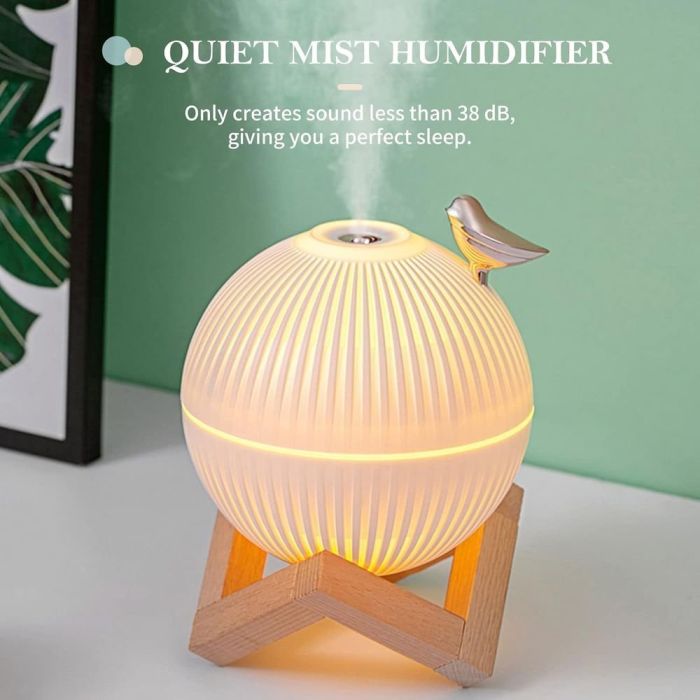 330ml Desktop Humidifier with LED Light Made of eco-friendly materials, this small and innovative humidifier features a gentle LED night light and a cheerful bird design. Maintaining air moisture is essential for respiratory health, especially in dry climates. It operates very quietly via USB charging, making it ideal for the bedroom, office, and car. It disperses a fine mist that helps humidify dry air, contributing to a healthier and more comfortable breathing environment. Its sleek and portable design is the perfect addition to improve air quality and add a touch of soothing lighting to your personal space.