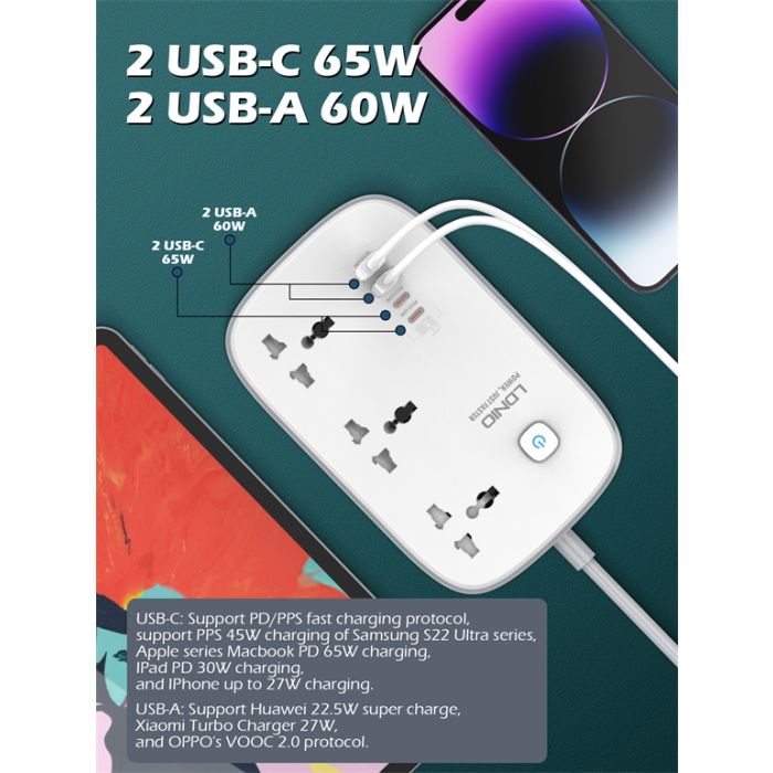 LDNIO multi power strip is a versatile and compact power strip designed to meet all your charging and power needs. It features three standard AC outlets, allowing you to plug in multiple devices simultaneously. Additionally, it comes equipped with four USB ports that utilize advanced GaN technology, ensuring fast and efficient charging for your smartphones, tablets, and other USB-powered devices.