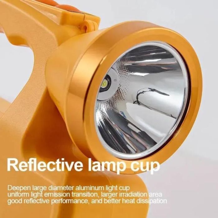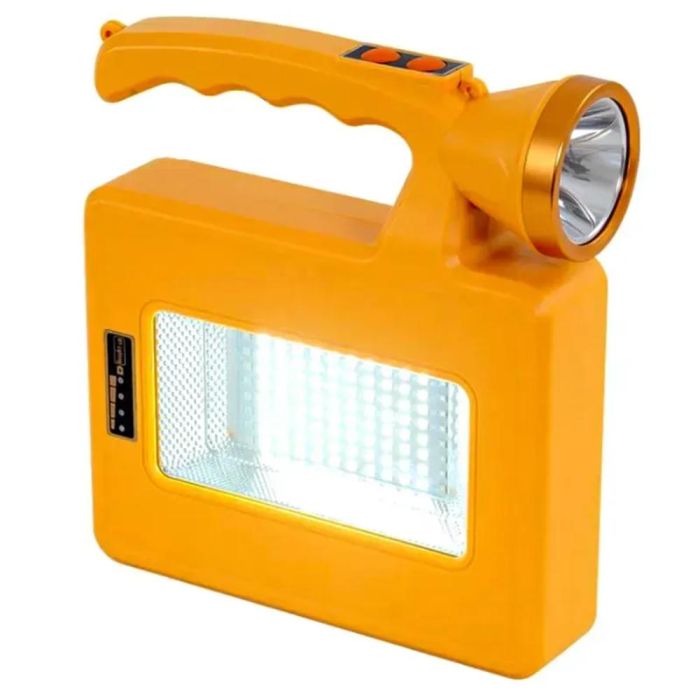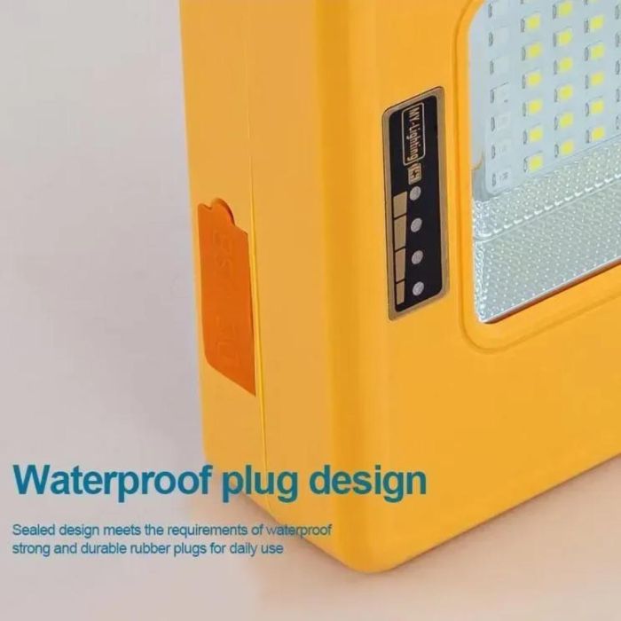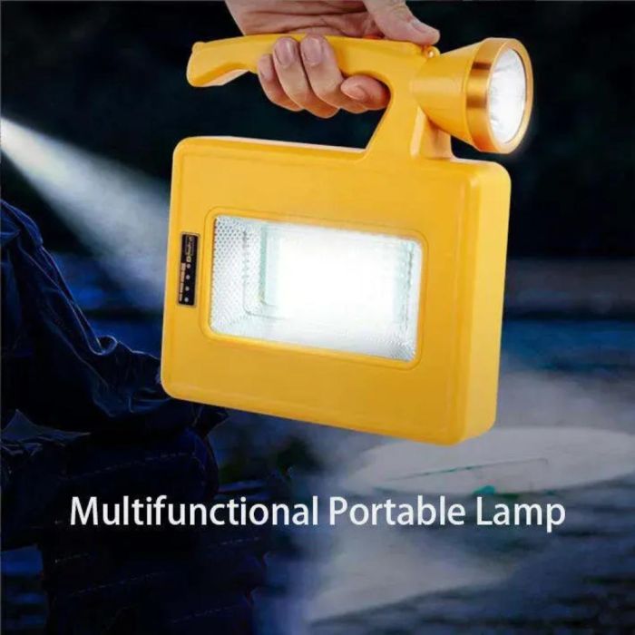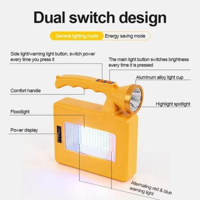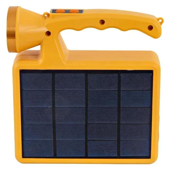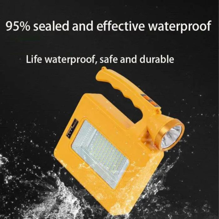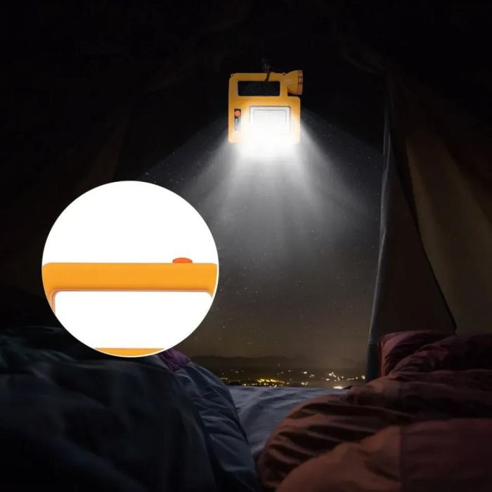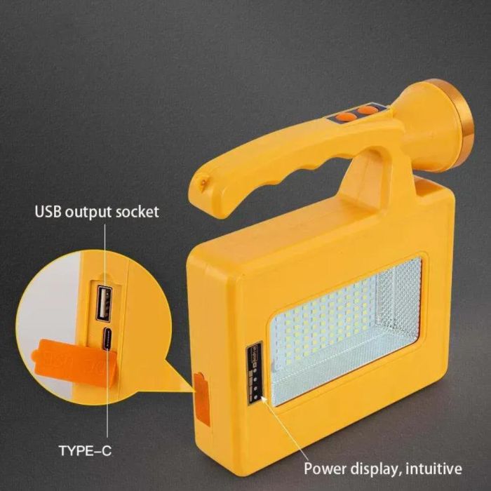 Get light and power anywhere with this portable spotlight, featuring a powerful battery and built-in solar panel. Ideal for use at home, camping, or on trips, it combines powerful lighting with a convenient charging function for your devices. It features four ultra-bright COB bulbs that provide powerful illumination for up to 6 hours of continuous illumination and can be easily charged via a USB-C port or the solar panel. Its durable, water-resistant design makes it ideal for use in all conditions.