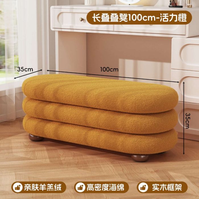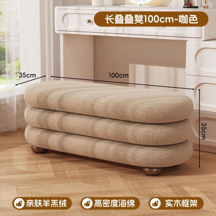 This Long faux wool dressing table stool with a solid wood base, offering a soft texture and comfortable seating, adding an elegant touch suitable for dressing tables and bedrooms with a calm modern style