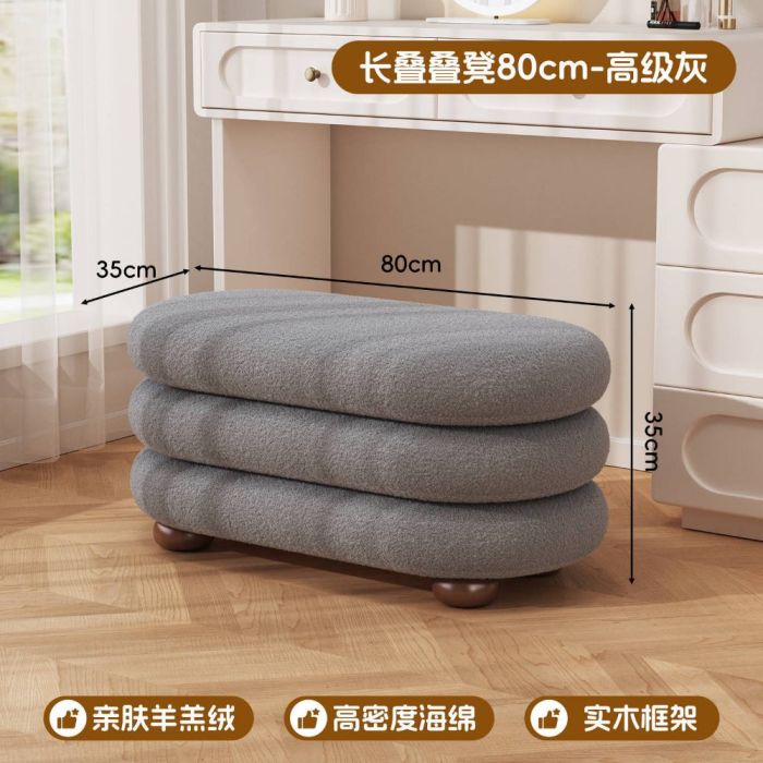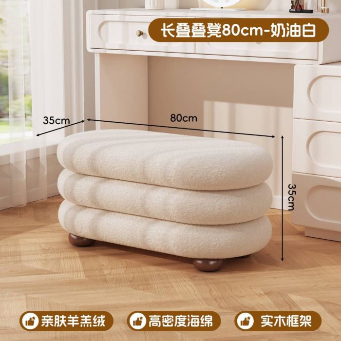 This Long faux wool makeup stool with a solid wood base, offering a soft texture and comfortable seating, adding an elegant touch suitable for dressing tables and bedrooms with a calm modern style