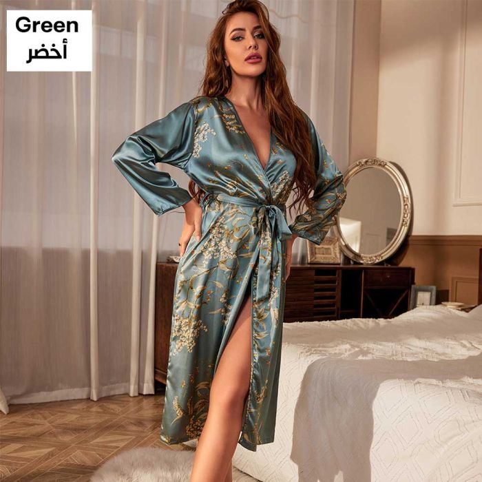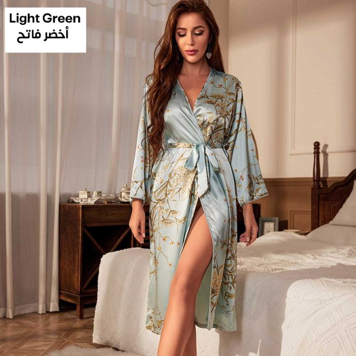 This A Long, Soft, Silky Robe for Women. Made from a Silk-like Material with a Printed Design and Long, Wide Sleeves, This Robe is Ultra-elegant and Ties Around the Waist, Making It Ideal for Wearing as a Morning Robe or a Stylish Bathrobe. It Drapes Softly over the Body and Provides a Luxurious Sense of Comfort. It is Lightweight and Timeless, Maintaining Its Quality for a Long Time, Reflecting a Refined Taste in Homewear.