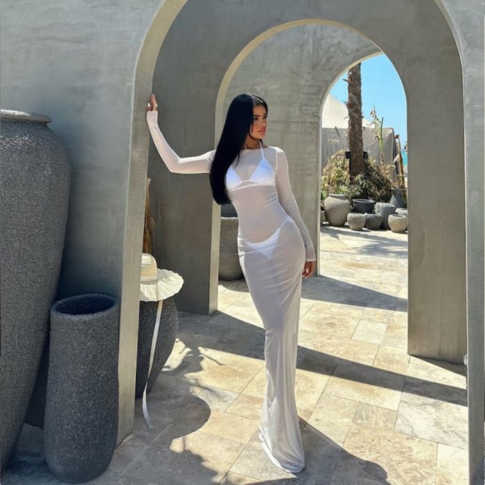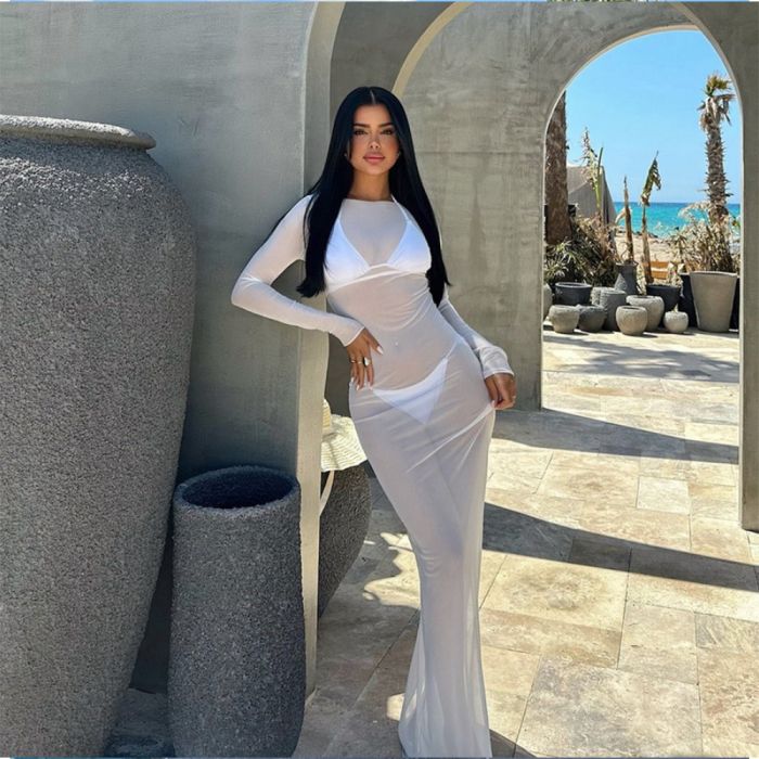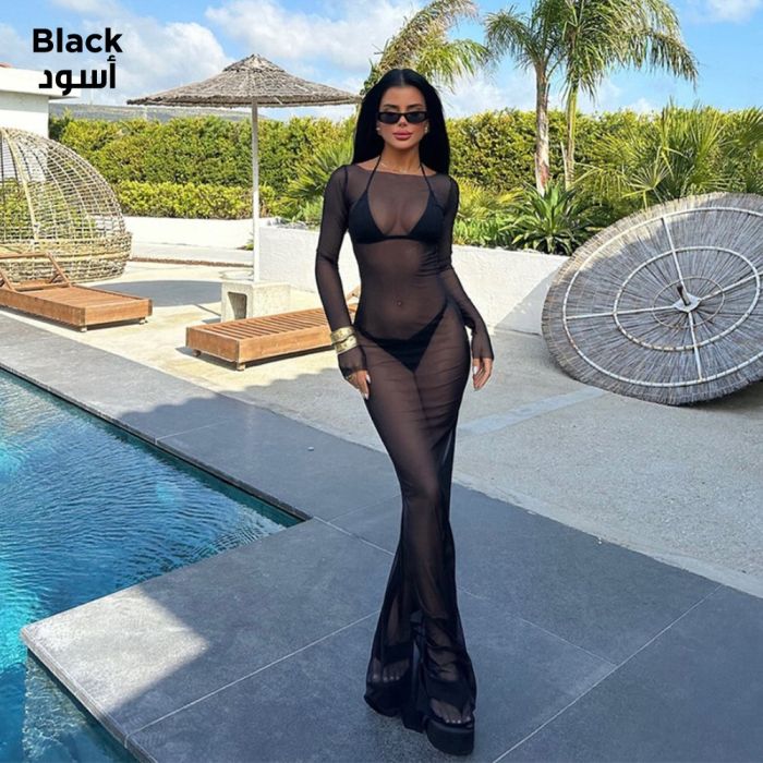 Enjoy the summer vibes with this elegant and comfortable maxi sheer dress. It features a flowing design and long sleeves that add a touch of sophistication and light sun protection, while the sheer fabric allows your swimsuit to stand out with a soft, feminine touch. It's perfect for layering over a swimsuit while you're going from beach to café or for a stroll on the beach. Its simple design makes it easy to pair with a wide-brimmed hat, sunglasses, and summer sandals.Today’s Deal is Long Sleeve Transparent Long Dress For Women