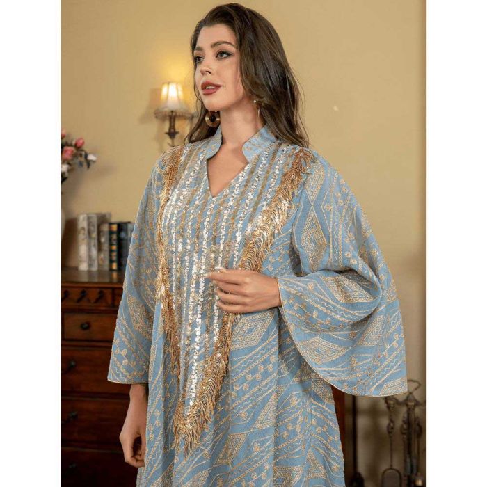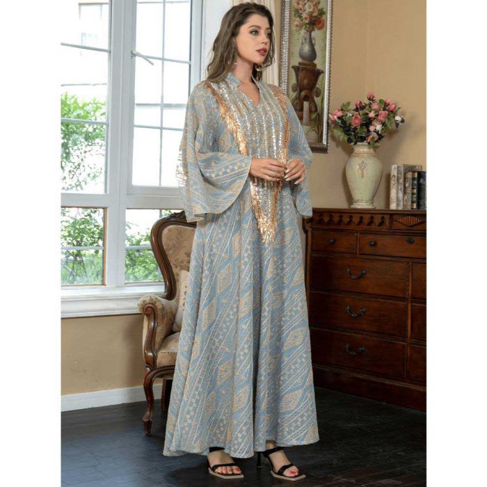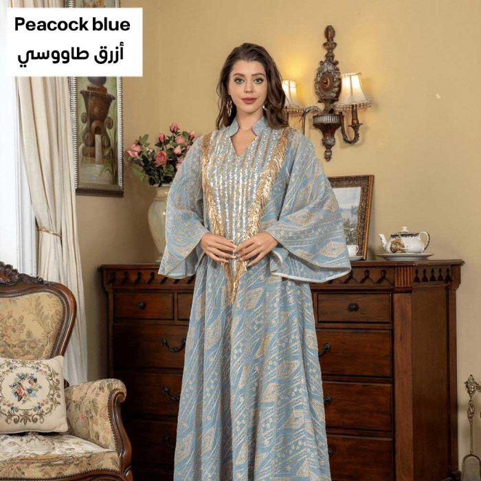 This Loose Arabic design dress for women made from soft polyester material, offering a refined flowing look, embellished details add a luxurious Middle Eastern touch, suitable for occasions and evening events with a confident and elegant presence