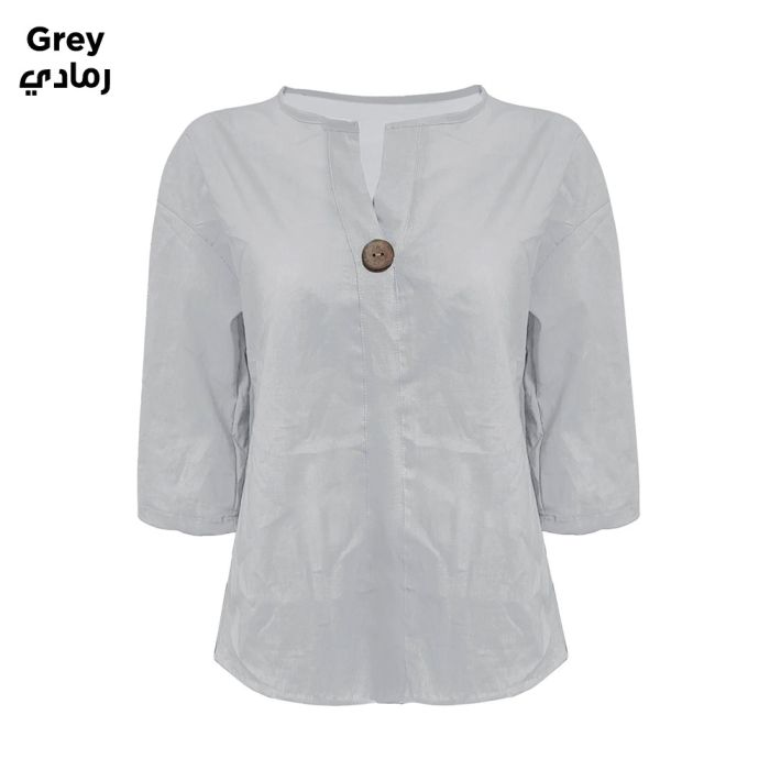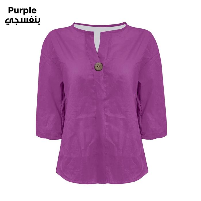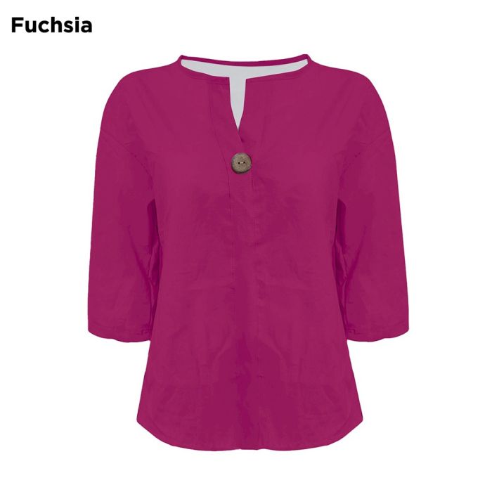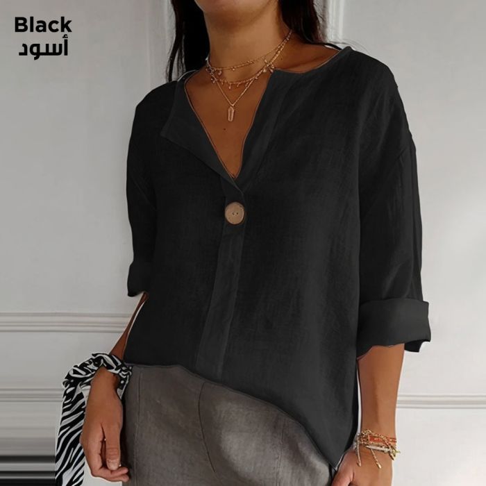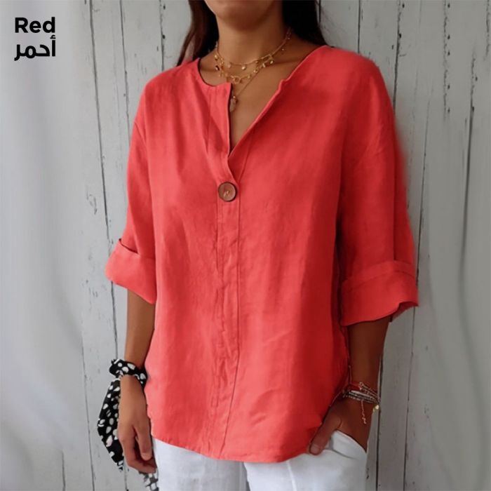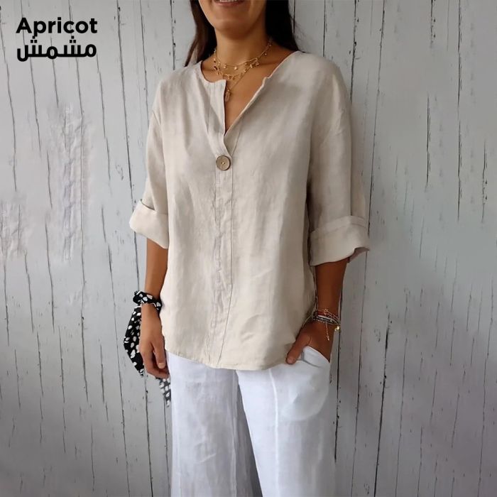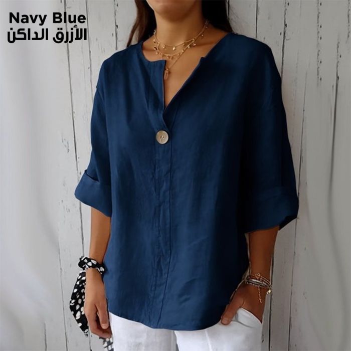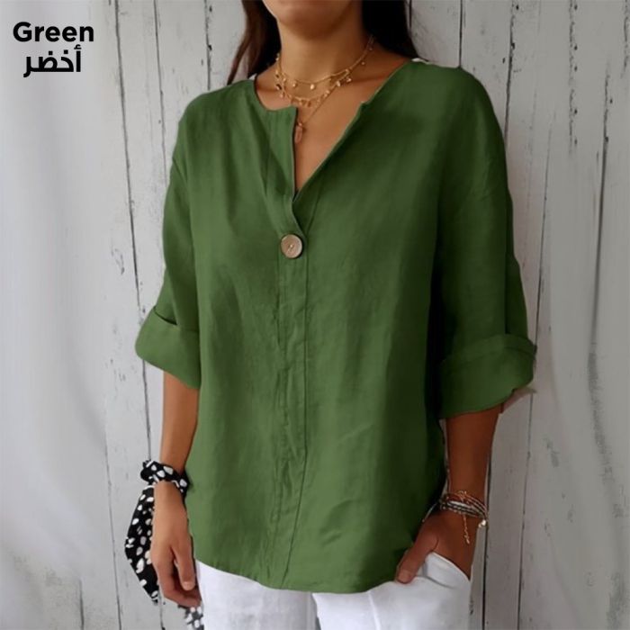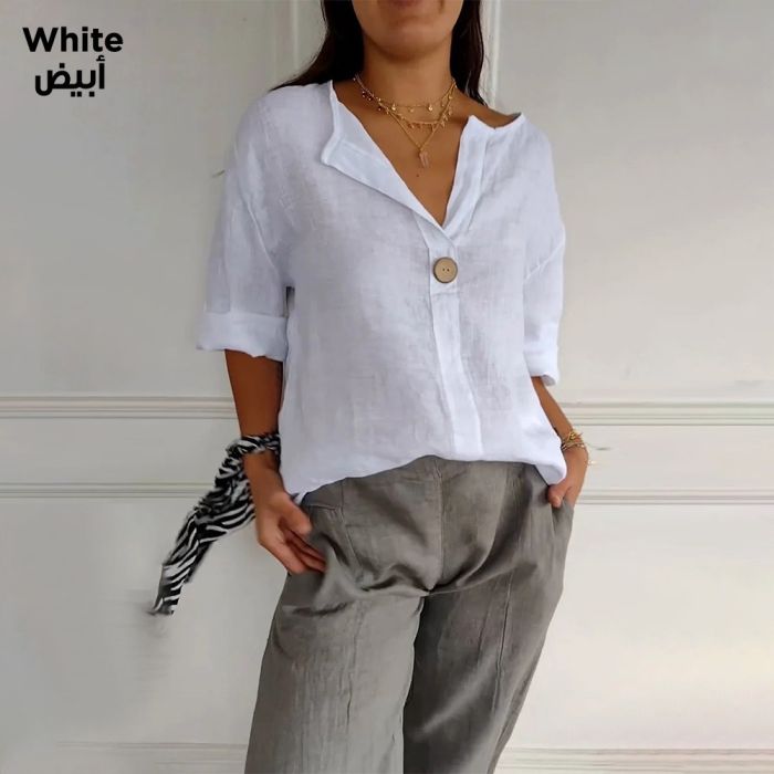 - Loose V-Neck Button-Down Linen Blouse For Women