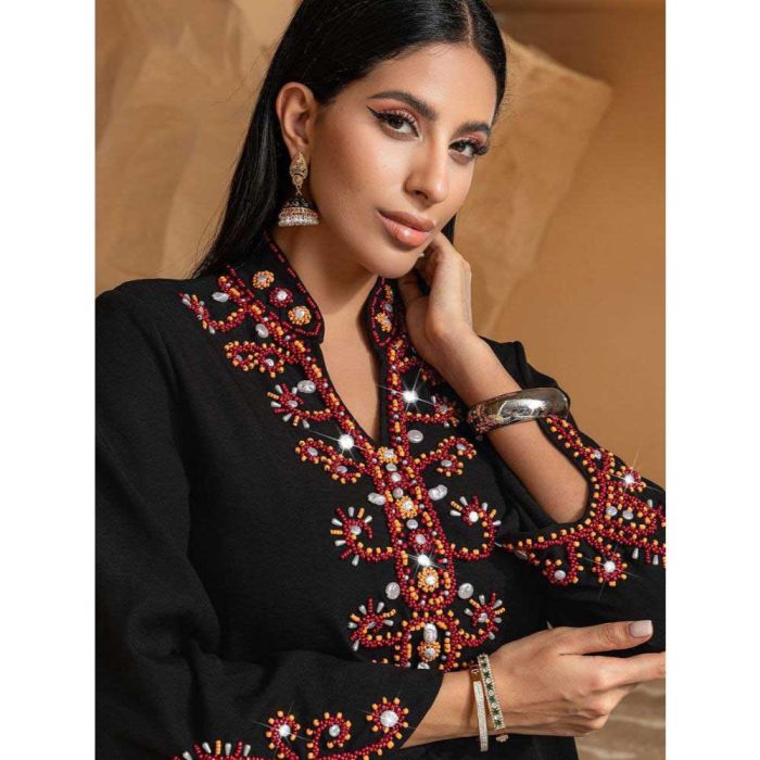 This Luxury beaded embroidered abaya for women made from soft polyester material, offering a refined look with carefully embellished details, elegant design highlights sophistication and completes evening and occasion wear with confident style