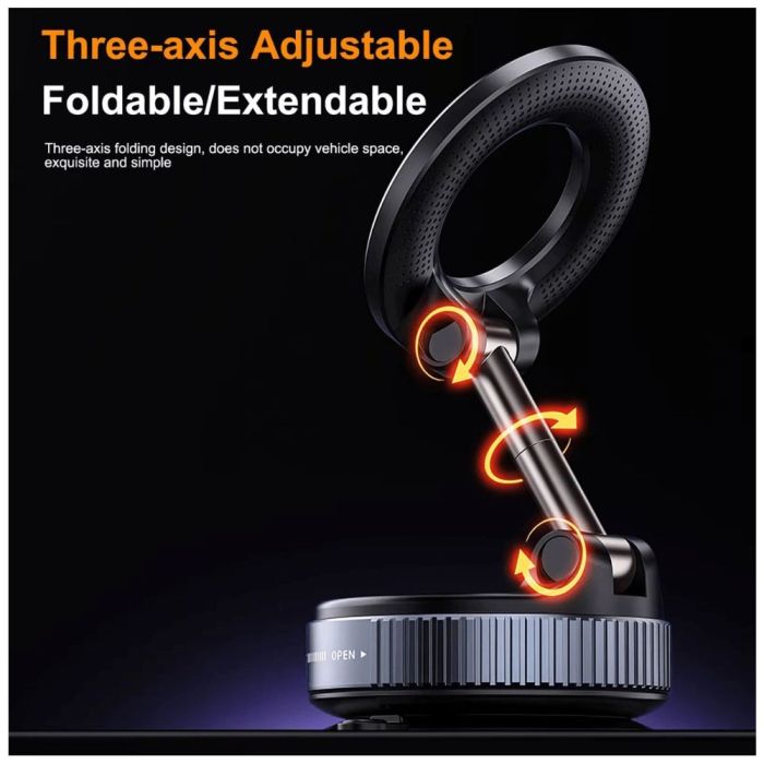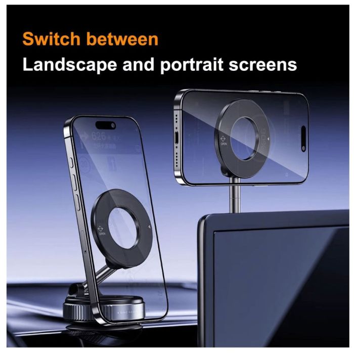 Elevate your driving experience with this magnetic phone mount, which provides superior stability for your phone. This mount combines smart suction technology and powerful magnets, providing a secure hold on any smooth surface like a car windshield or dashboard. Thanks to the powerful N52 magnets, you won't have to worry about your phone falling while you're on the go. You can easily rotate the mount 360 degrees for the perfect viewing angle. It's compatible with all smartphones and supports MagSafe technology, and comes with a special metal ring for phones that don't support this feature.