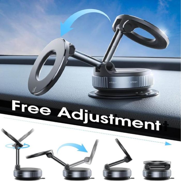 Innovative dual-suction and magnetic mounting design. The phone holder provides a secure and convenient solution for holding your phone or GPS device safely while on the go, equipped with a strong magnet that provides stability and security for your device. Meanwhile, the powerful suction base can be easily attached to any smooth surface in your car. The dual design allows for mounting on various surfaces such as car screens, wall tiles, and desks using either magnets or suction cups. The extendable arm with hinges allows for easy angle adjustment for optimal viewing