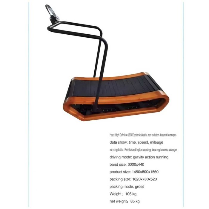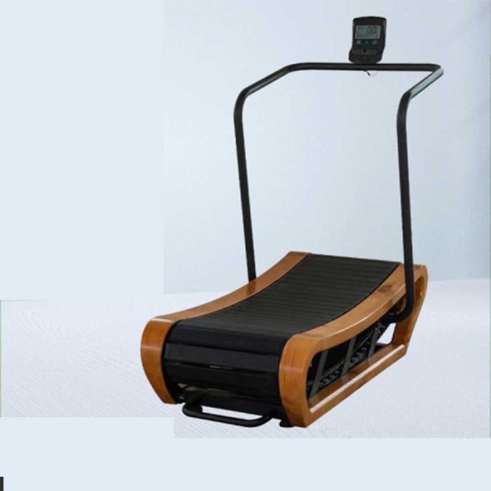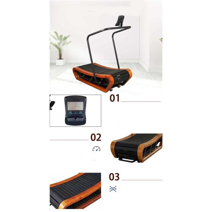This curved mechanical treadmill with digital display combines elegant wooden craftsmanship and high durability. It operates without electricity, offering a natural self-powered running experience. Equipped with an LED screen showing time, speed, and distance, it ensures smooth performance with a curved deck and transport wheels for easy mobility and storage.