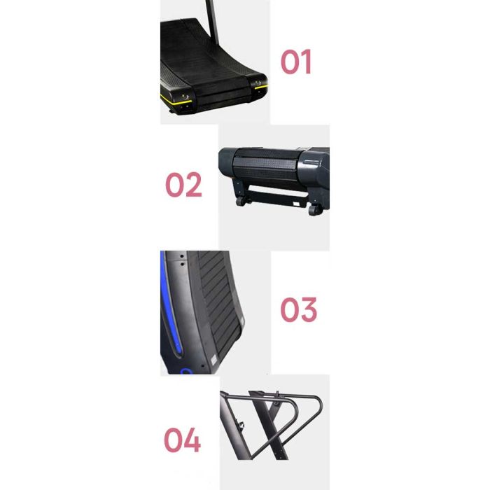This mechanical running and walking treadmill with a 15 km/h speed and a digital screen provides an effective training experience through its curved belt and self-powered motion that offer full speed control, along with a flexible surface that protects the knees, strong construction, integrated wheels for easy transport, foldable design for space saving, and clear display of essential training data.