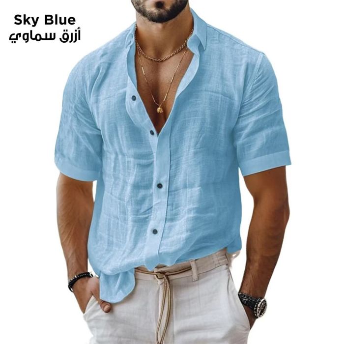 This stylish casual cotton shirt for men is crafted from luxurious cotton and linen fabric, offering unparalleled comfort throughout the day. Its modern design combines elegance and simplicity, featuring practical pockets and short sleeves suitable for summer weather. This makes it the perfect choice for the modern man seeking both style and comfort. Available in an attractive sky blue color that suits various tastes and occasions.