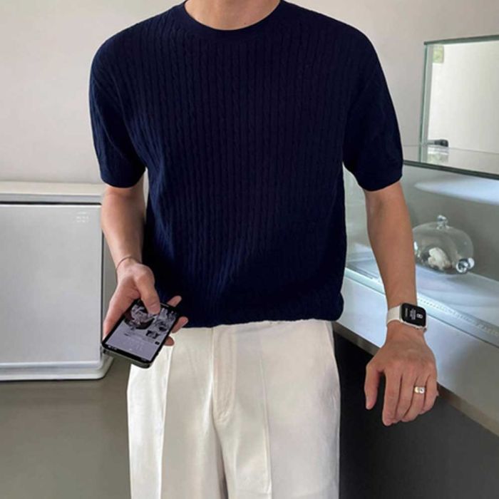 This Men's Half Sleeve T-Shirt is Made from Lightweight, Breathable Knitted Yarns for Excellent Ventilation in Summer Weather. It Features a Modern Korean Design with a Round Neck and Short Sleeves, Making It a Stylish and Comfortable Piece That Can Be Worn as Underwear or a Light Outerwear. It Offers a Casual and Attractive Look That Matches Modern Everyday Looks, and Is Ideal for Young Men Seeking Comfort and Style Together.