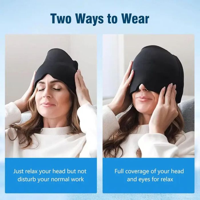 Effectively relieve headaches and migraines with this carefully designed cooling cap that covers your head 360° and provides comfortable, balanced cooling. To use, place it in an airtight bag such as a Ziploc and refrigerate for 1–2 hours, or freeze it at -20°C for deeper cooling. If it's too cold, leave it for a few minutes to firm up. Storage in the bag prevents odor absorption. Ideal for relieving headaches, tension, insomnia, and eye strain, thanks to its ergonomic design and precise pressure points.