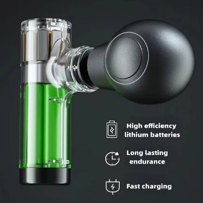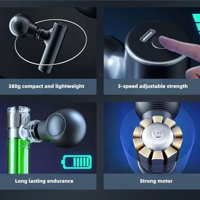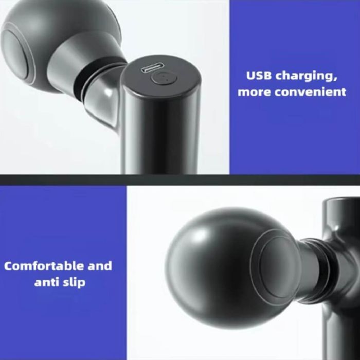 This massage gun is your perfect companion for fast and effective muscle recovery. This compact and lightweight device is equipped with a powerful motor that delivers a deep, relaxing massage to relieve muscle pain and tension all over your body. With 3 adjustable intensity levels, you can easily customize the massage intensity to suit your needs, from a gentle warm-up to a deep tissue massage. The built-in battery provides up to 60 minutes of use on a single charge and can be easily recharged via a USB port
