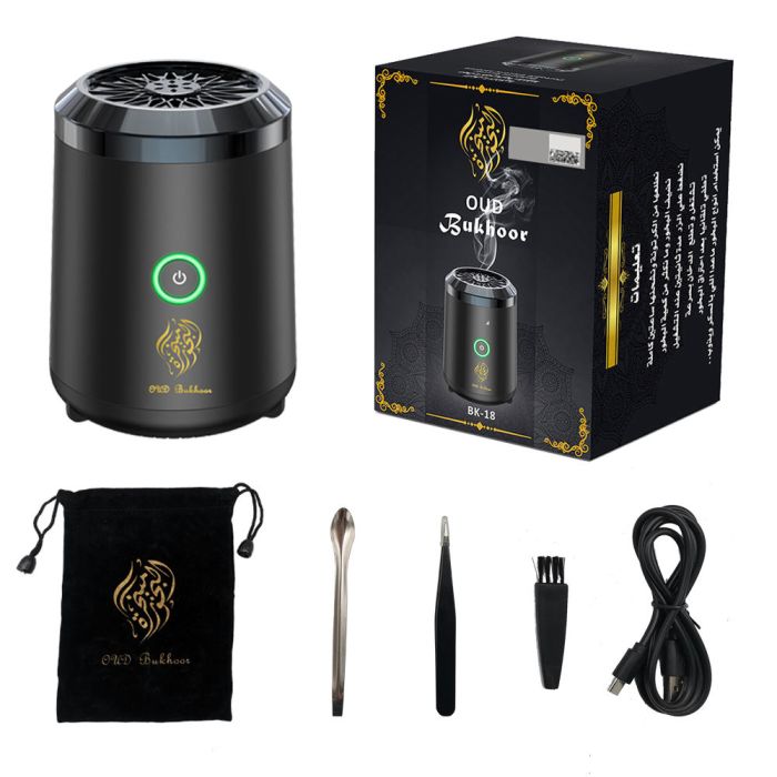 Adding a touch of elegance, it boasts an LED-illuminated power button and supports various types of incense, including wood chips, resin incense, and traditional oud. Practical accessories are included, such as tongs, a cleaning brush, a USB cable, and a storage case.