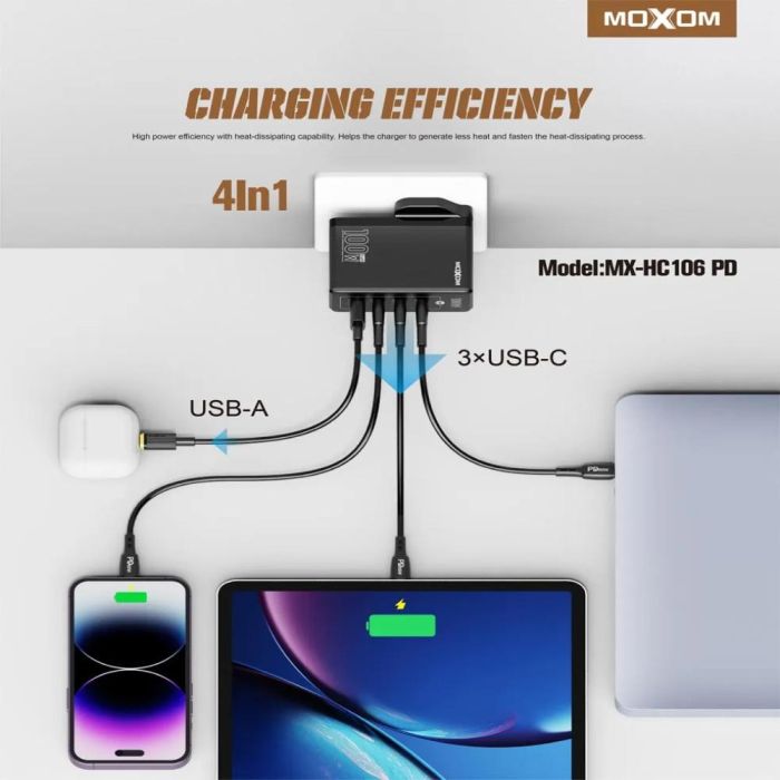 The Moxom charger features the latest global GaN charging technology to deliver powerful performance in a compact size and high efficiency. It supports Power Delivery fast charging up to 100W, with three USB-C ports and one USB-A port for safely and stably powering and charging phones, tablets, laptops, and smart accessories.