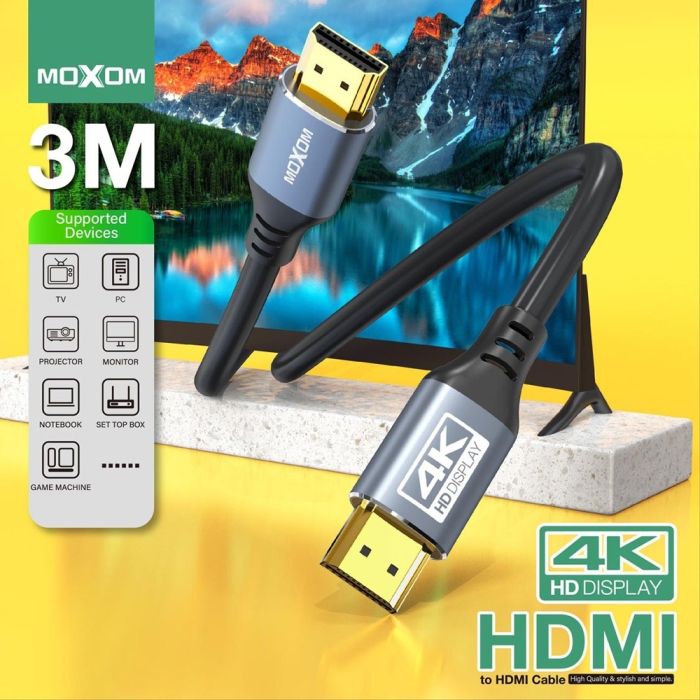 Moxom 4K HDMI to HDMI Cable is a 3-meter cable used to connect devices with HDMI ports to a TV or digital display. The cable supports the 4K resolution, providing high-quality video and audio output for an immersive viewing experience.