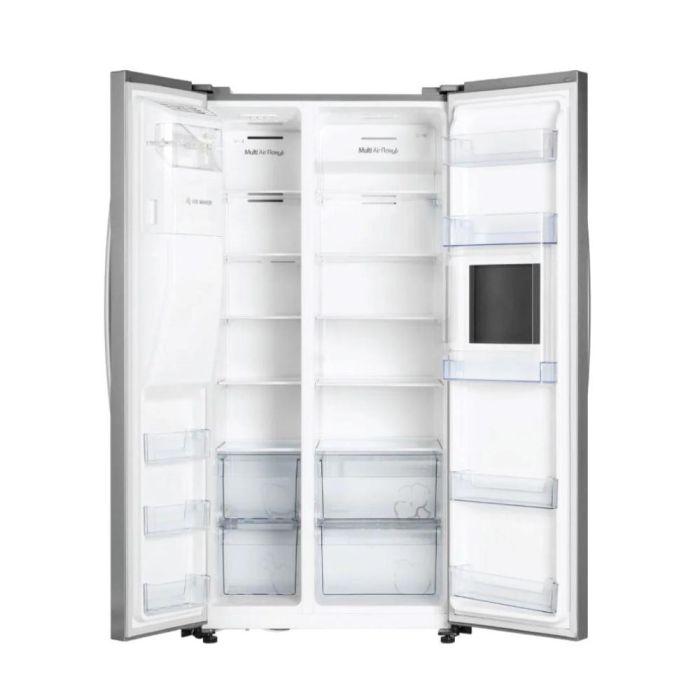 The Hoover 700-liter Side-by-Side refrigerator offers an ideal solution for large spaces and families, with a stylish design and advanced technologies to keep food at its best. It features a No Frost system that prevents ice buildup and ensures even cooling across all shelves. It includes an automatic water and ice dispenser, as well as an energy-efficient inverter compressor that operates quietly. It also offers smart modes such as Holiday Mode and a multi-airflow system to keep food fresher for longer.