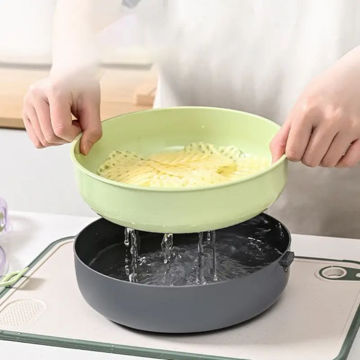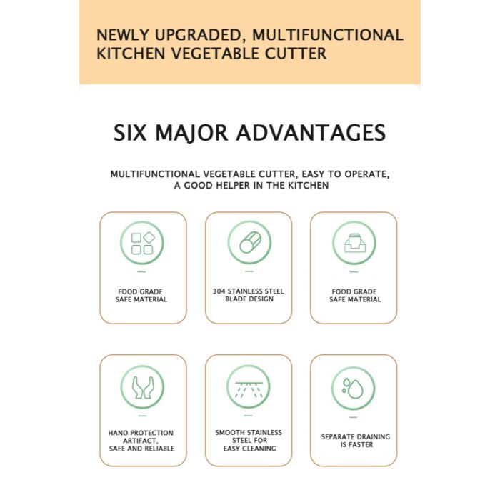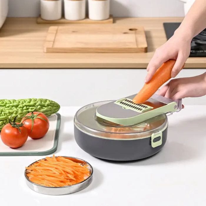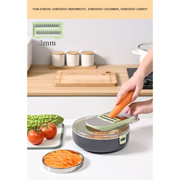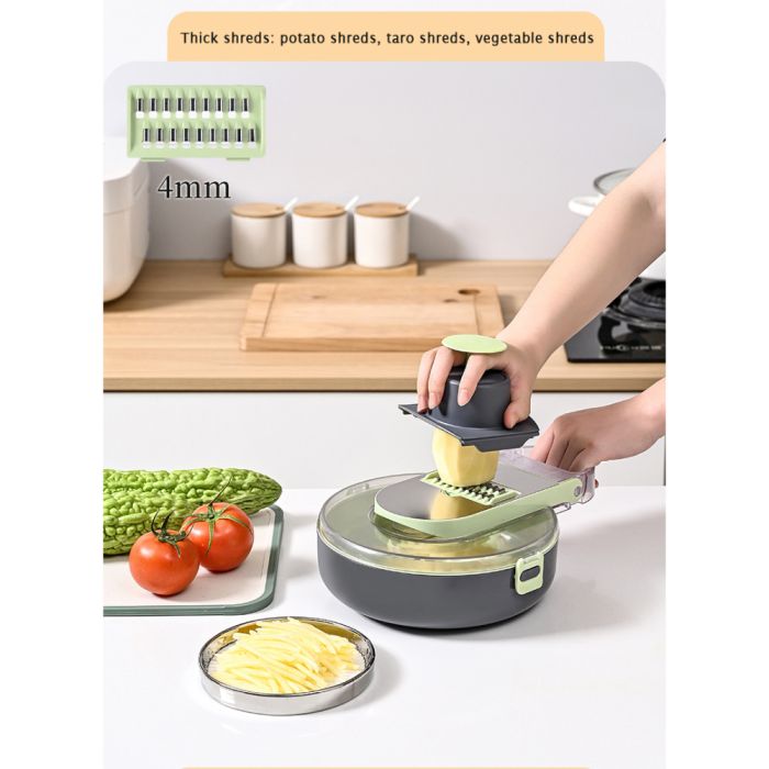 The 9-in-1 Vegetable Chopper & Slicer revolutionises meal prep with its versatile functions, allowing you to slice, dice, and shred vegetables effortlessly. Equipped with a drain basket and a handguard, it ensures safe and hygienic food handling. This multi-functional tool includes various blades for different cuts, making it ideal for preparing fresh, delicious meals in less time. The sharp blades provide precision, while the handguard protects your fingers, offering both safety and efficiency in one compact design